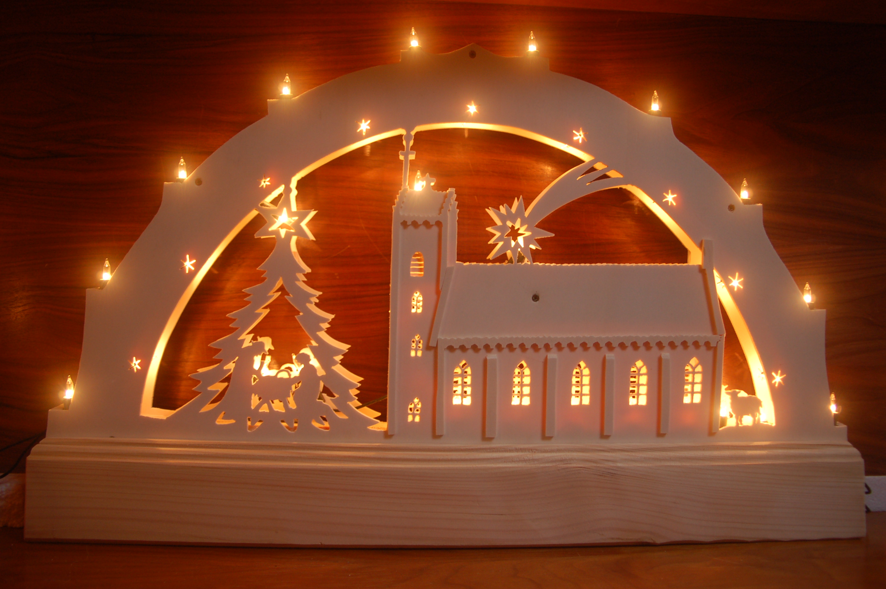 Schwibbögen/Lichterbögen, Handarbeit, Kirche Holthusen. Das ideale Geschenk zu Weihnachten. H. Swart, Heidjer Str. 27, Tel. (04951) 8824.
