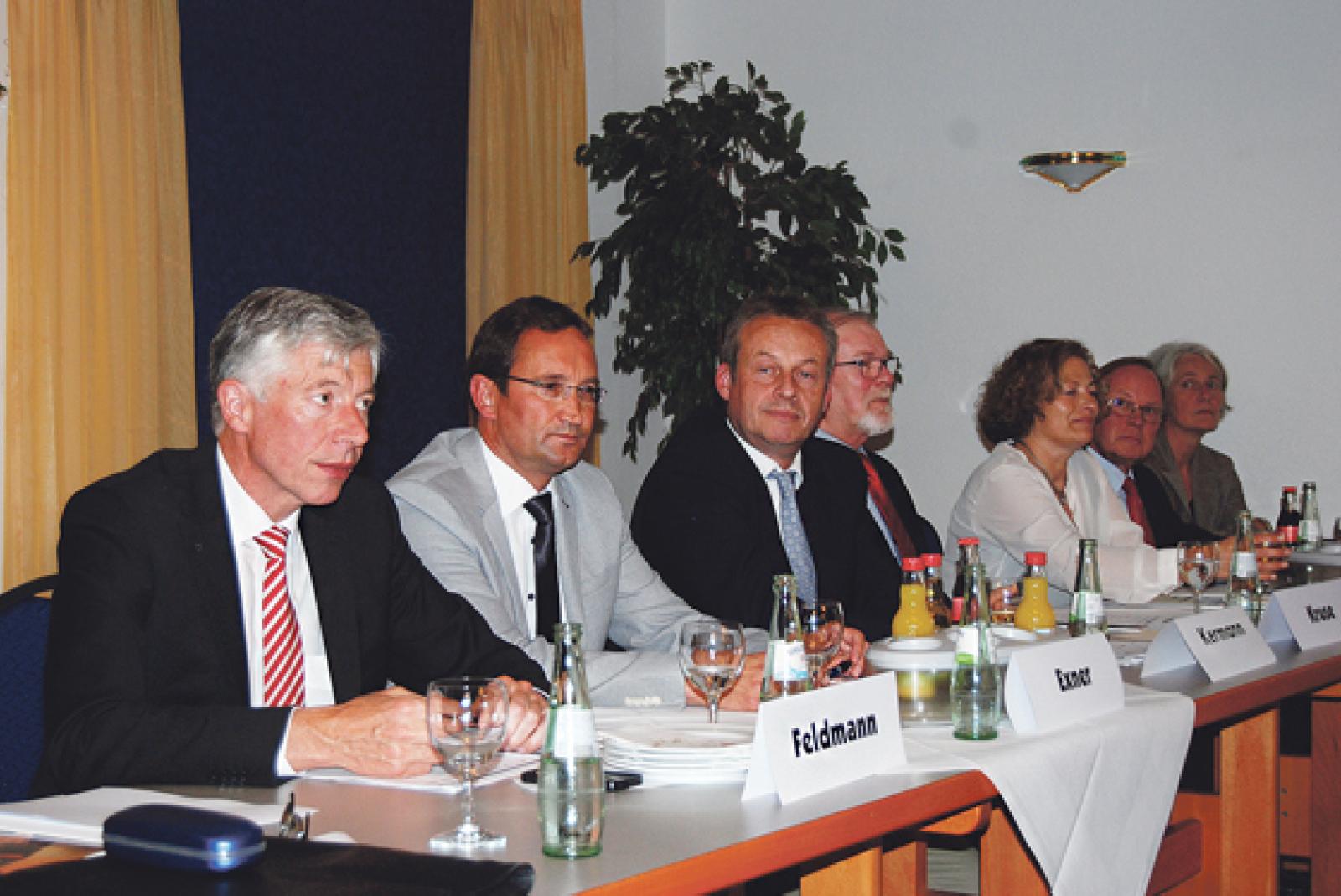 Führen den Bauverein: (von links) Der stellvertretende Aufsichtsratsvorsitzende Heinz Feldmann, der technische Vorstand Thomas Exner, der kaufmännische Vorstand Stefan Kermann, die nebenamtlichen Vorstandsmitglieder Jochen Kruse und Kerstin Pauw, der bisherige Vorstand Fritz Zitterich und das Aufsichtsratsmitglied Ursel Nimmrich. Es fehlt Aufsichtsratsvorsitzender Günther Boekhoff. © Foto: Hoegen