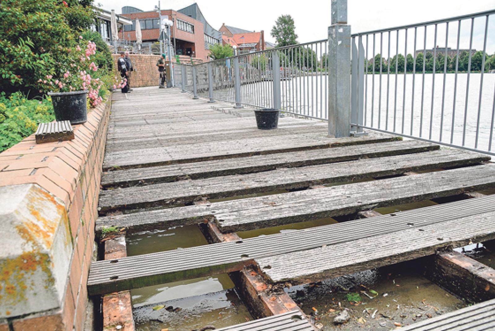 Die Sanierung der Hafenpromenade in Leer hat am Montagvormittag begonnen: Die Holzbaufirma Quappen aus dem emsländischen Sögel hat das Teilstück zwischen dem Ruderverein Leer und der Tourismus-Zentrale gesperrt. Der Grund: Der Holzweg wird erneuert. Die Trägerbalken ...