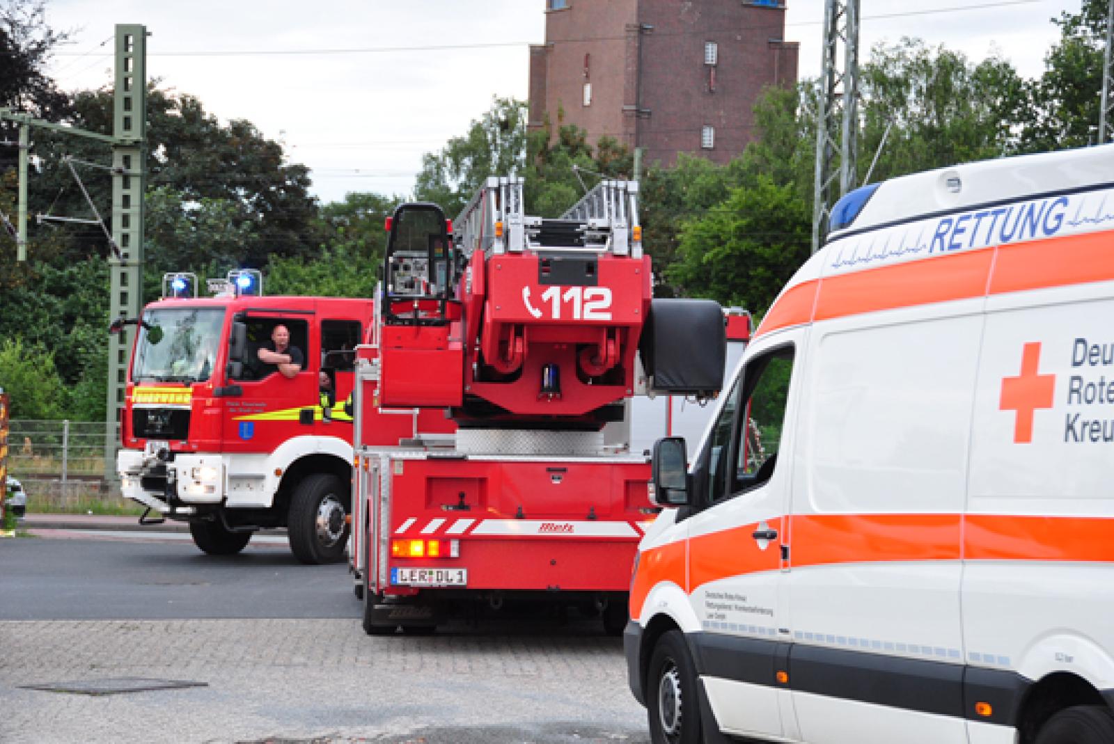 Feuerwehr und Rettungskräfte rückten zu einem vermeintlichen Brandeinsatz in der Annenstraße in Leer. Tatsächlich jedoch hatten Jugendliche mit Feuerlöschern hantiert. © Foto: Wolters