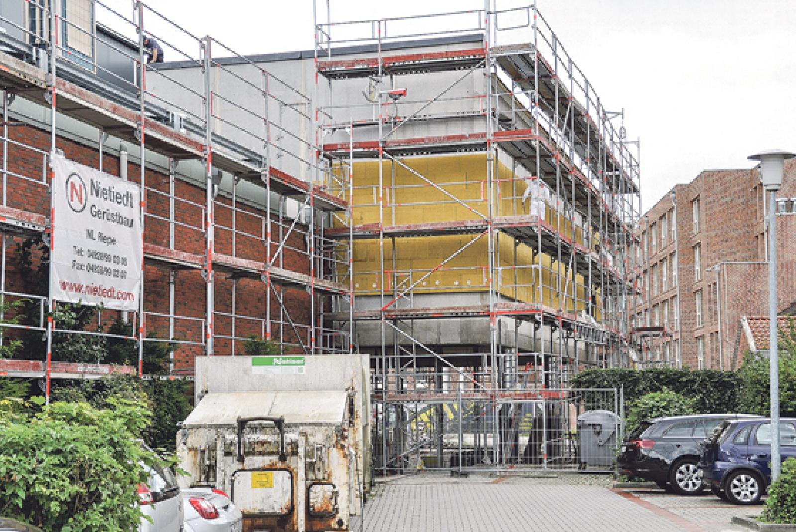 Hinter dem Kino am Denkmalsplatz in Leer entsteht gerade ein Anbau, der aus Stelzen steht. In dem neuen Komplex wird es einen Saal mit 125 Sitzplätzen geben. © Foto: Wieking
