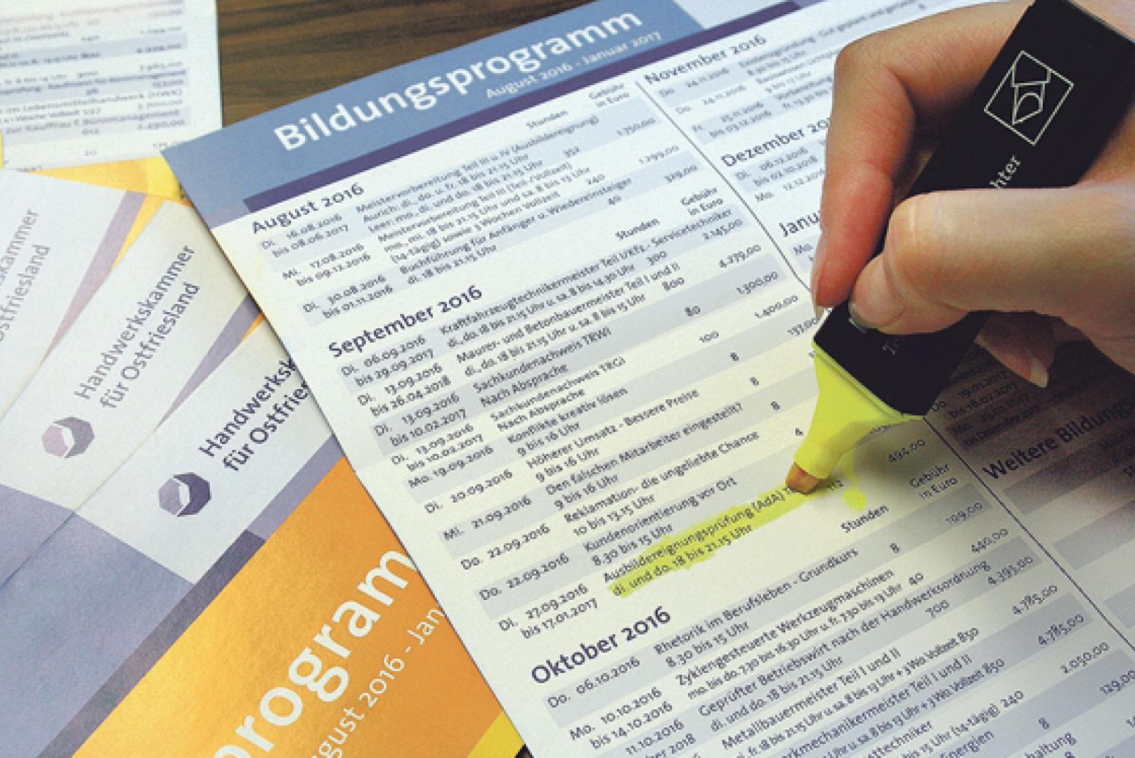 Endlich den Ausbilderschein angehen? Ein Meister werden? Oder doch den Betriebswirt anstreben? Weiterbildungswillige Handwerker – Selbstständige, Arbeitnehmer und Auszubildende – werden im neuen Bildungsprogramm 2016/17 des Berufsbildungszentrums (BBZ) in Aurich fündig.