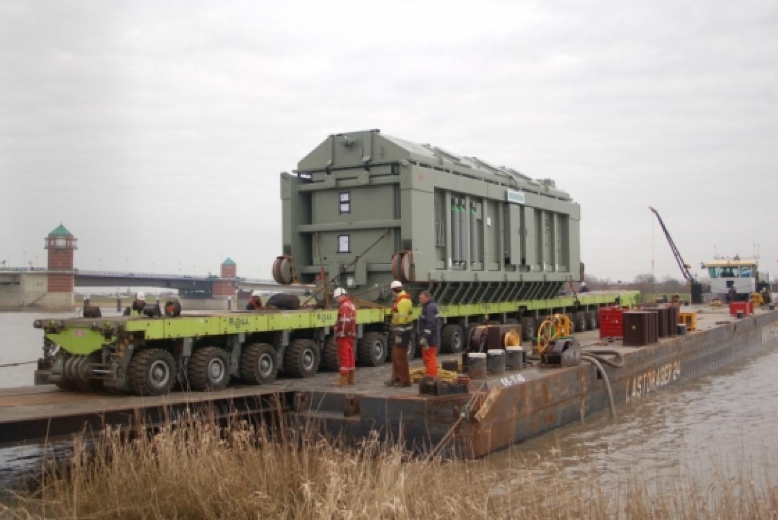 Der erste von zwei Transformatoren für die Konverterstation »BorWin2« in Diele ist gestern über die Ems in Bingum angekommen. Das 380 Tonnen schwere Gerät kommt aus Nürnberg und wird seinen Weg nach Diele am Sonntag fortsetzen. Dafür ...