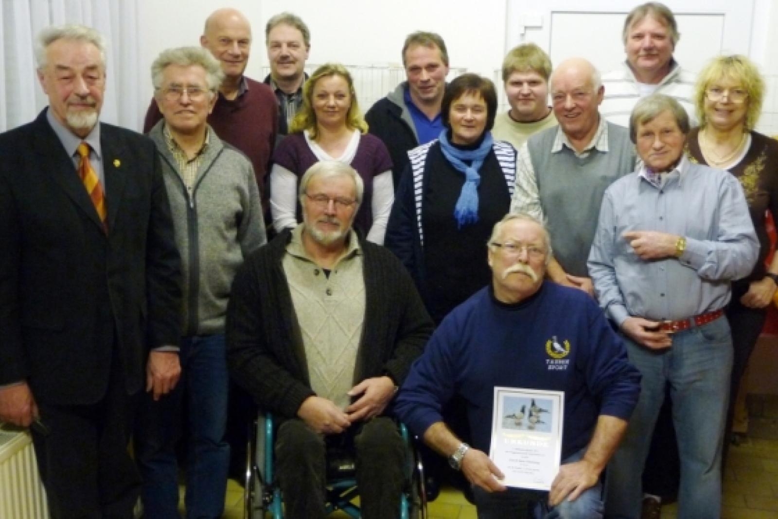 Bei der Meisterehrung, von links: Vorsitzender Detert Feddinga, Adolf Tritthardt, Dirk de Beer, Johann Rumpf junior, Evira und Rolf Nieland, Gerda Eeten, Frank Gerdes, Jan Smid, Hermann Tirrel, Tjark Janssen und Eva Flemming. Vorn sitzend Gerhard Baumfalk und Hans Flemming. © Foto: privat