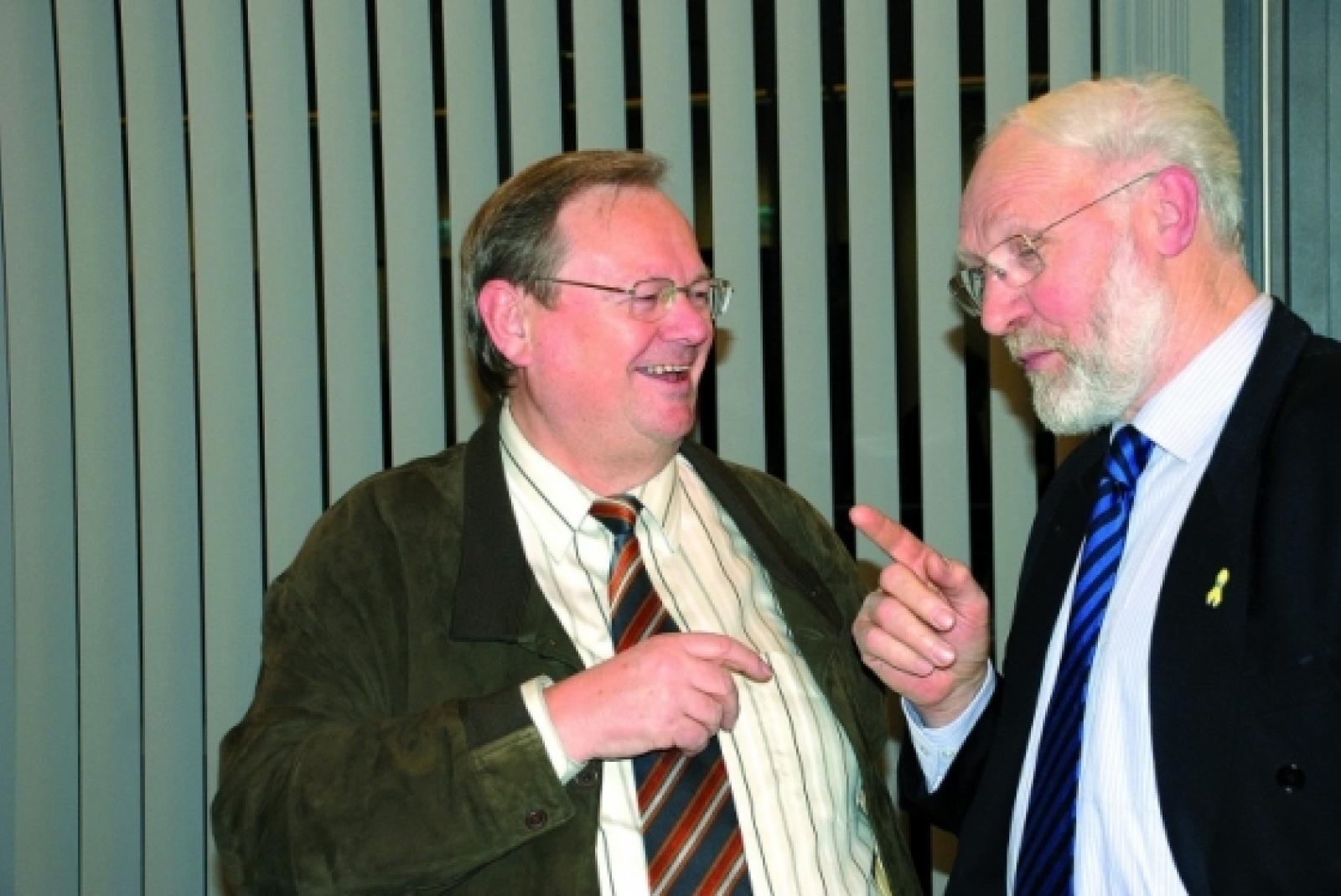 Verstehen sich - wie hier bei einem Gespräch im Leeraner Kreistag - offensichtlich gut: Dieter Baumann aus Warsingsfehn (CDU, großes Bild links) und Arnold Venema aus Jemgumgeise (FDP). Bei der Landtagswahl am 20. Januar 2013 könnten sie gegeneinander antreten - und wären damit zugleich Kontrahenten von Johanne Modder (SPD) und Hajo Rutenberg (Grüne).  © Foto: RZ-Archiv