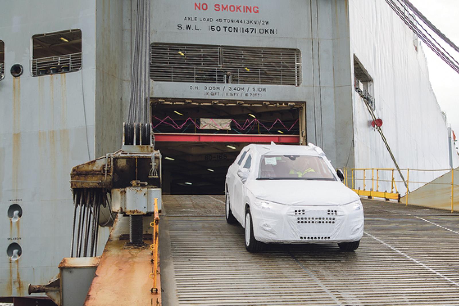 Anfang November: Die ersten Audi Q?5 rollen im Emder Hafen vom Schiff. © Foto: Norbert Schnorrenberg