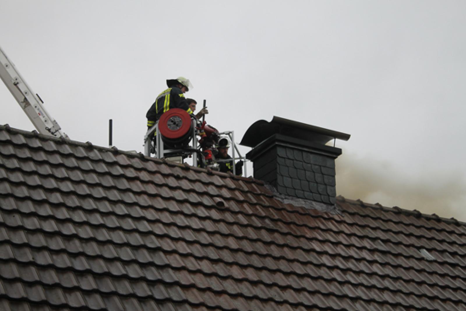 Der Schornsteinfeger musste dabei die Ablagerungen im Schornstein, auch mit Hilfe der Hubrettungsbühne, vom Dach des Wohnhauses aus lösen.