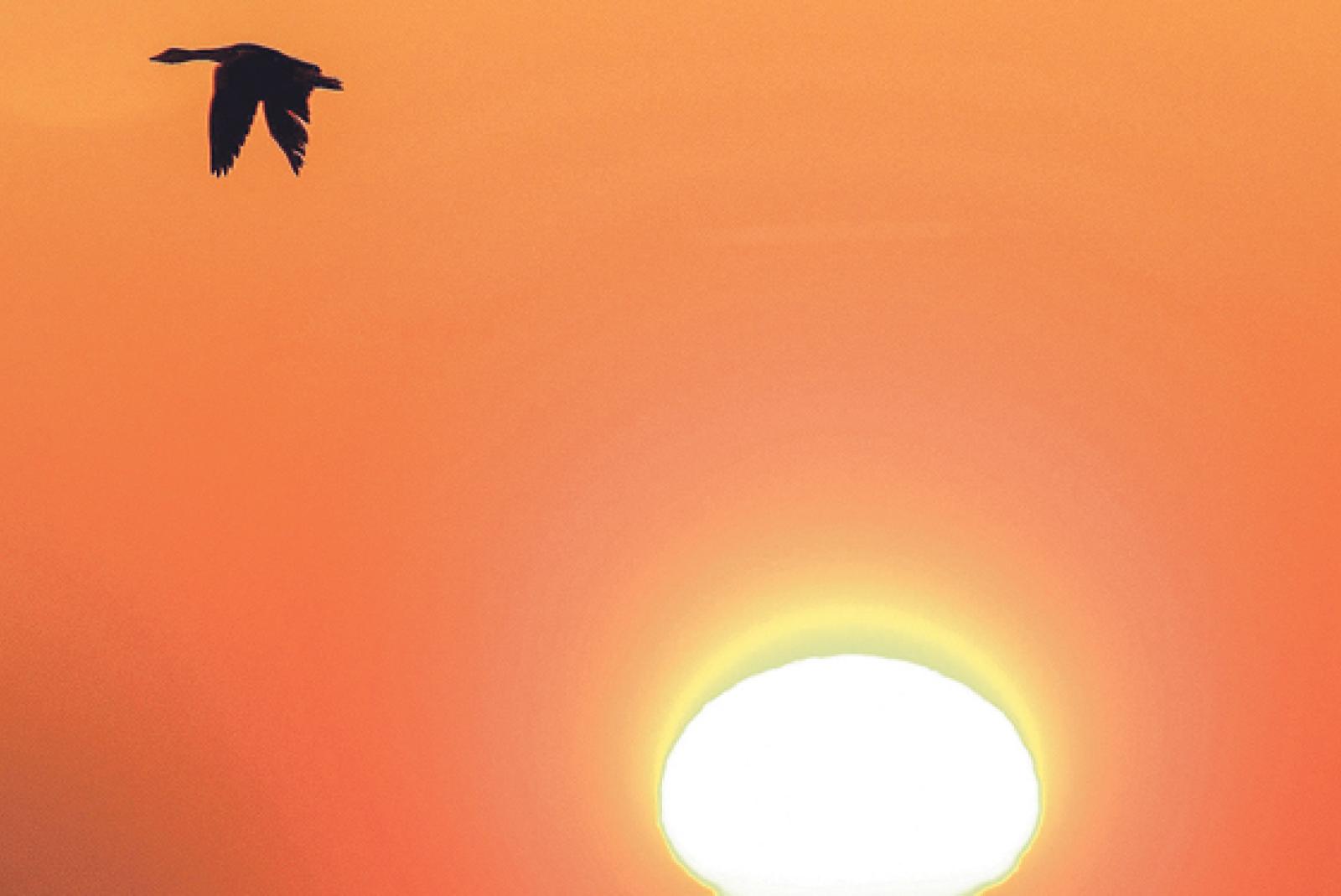 Eine Graugans fliegt beim Sonnenaufgang über der Ems ins Rheiderland. © Foto: Eilert Voß
