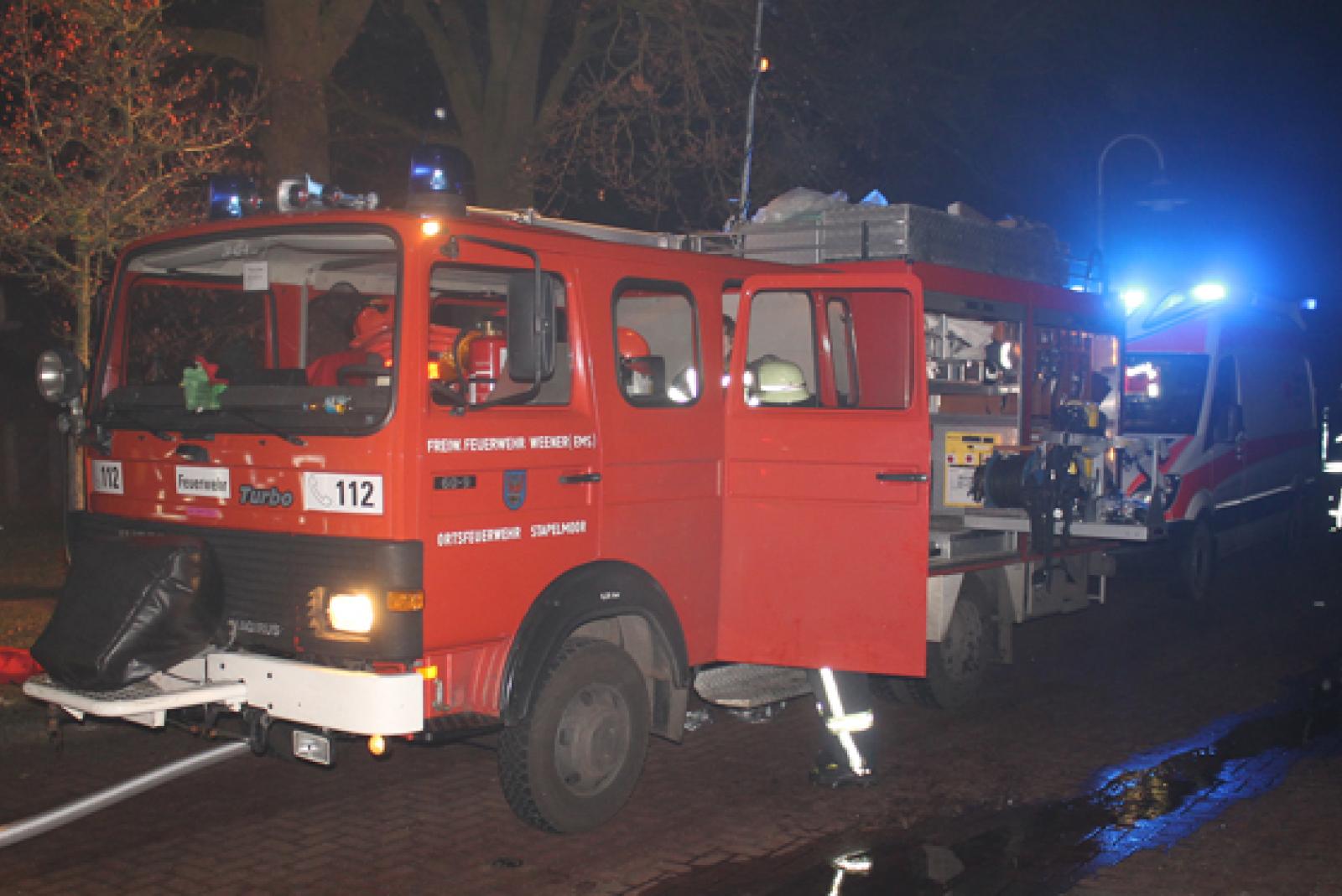 Unterdessen löschte die Feuerwehr den Brand ab. Das Feuer hatte sich noch nicht weiter ausbreiten können. Mit der Wärmebildkamera wurden im Anschluss noch versteckte Glutnestern gesucht. Das verrauchte Haus wurde belüftet. Im Einsatz waren die Feuerwehr Stapelmoor mit dem Löschgruppenfahrzeug LF 8 und die Feuerwehr Weener dem Löschgruppenfahrzeug LF 16, dem Tanklöschfahrzeug TLF 16, der Hubrettungsbühne HRB 32, dem Einsatzleitwagen ELW mit insgesamt 40 Einsatzkräften sowie ein Rettungswagen, ein Notarzt und die Polizei. Die alarmierte »SEG Florian« des DRK brauchte nicht mehr ausrücken.Nach rund einer Stunde war der Einsatz für die Feuerwehr beendet. Die Polizei hat die Ermittlungen zur Brandursache aufgenommen.