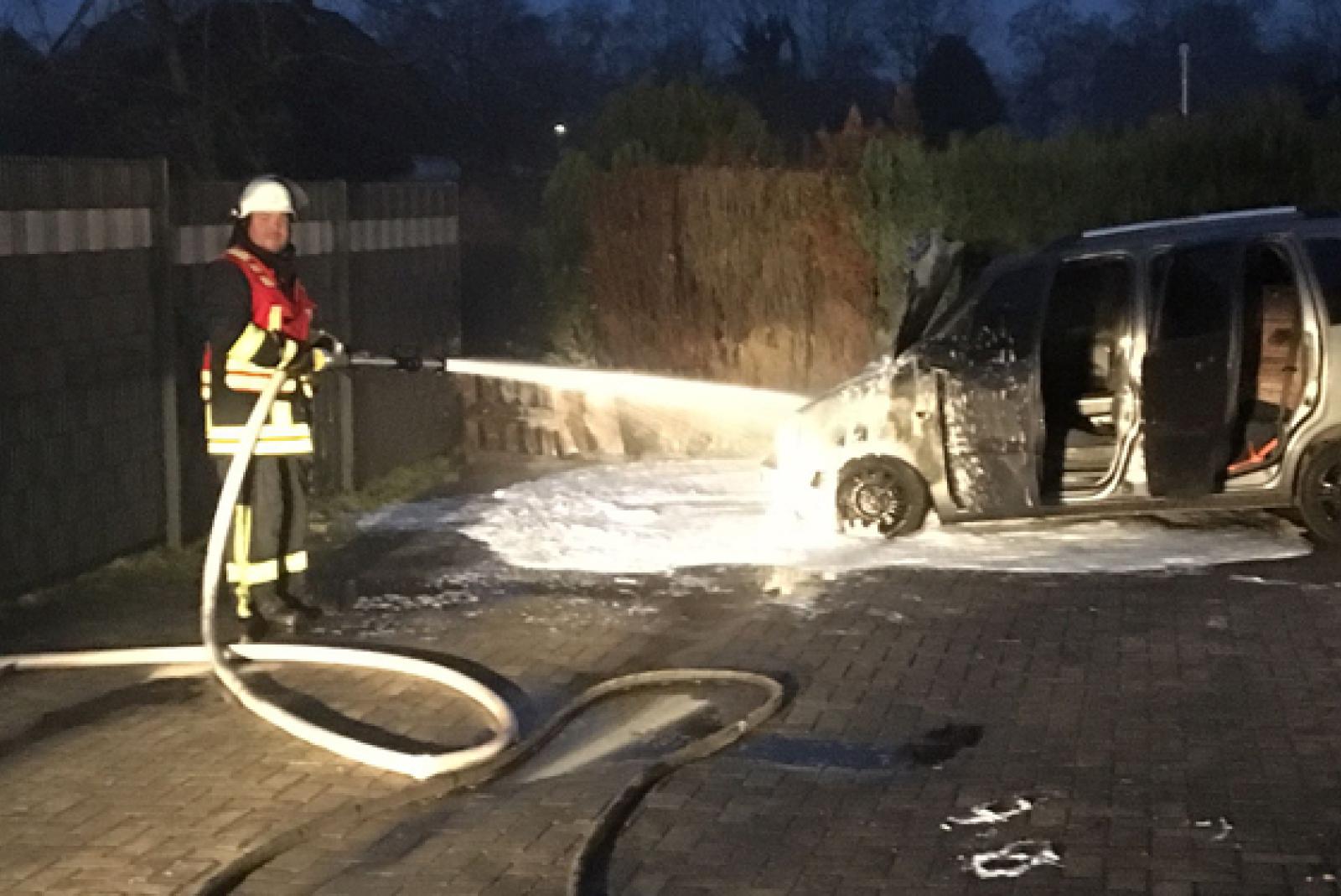 stand bereits in Vollbrand. Unter schwerem Atemschutz brachte die Feuerwehr den Brand unter Kontrolle. Durch die schnelle Reaktion des Eigentümers konnte ein Schaden am Carport und am Gebäude verhindert werden. Der Opel wurde durch das Feuer jedoch nahezu vollständig zerstört. Um erneute Flammen durch Glutnestern zu verhindern, setzte die Feuerwehr Schaum ein. Zusätzlich wurde das gelöschte Fahrzeug mit der Wärmebildkamera kontrolliert.