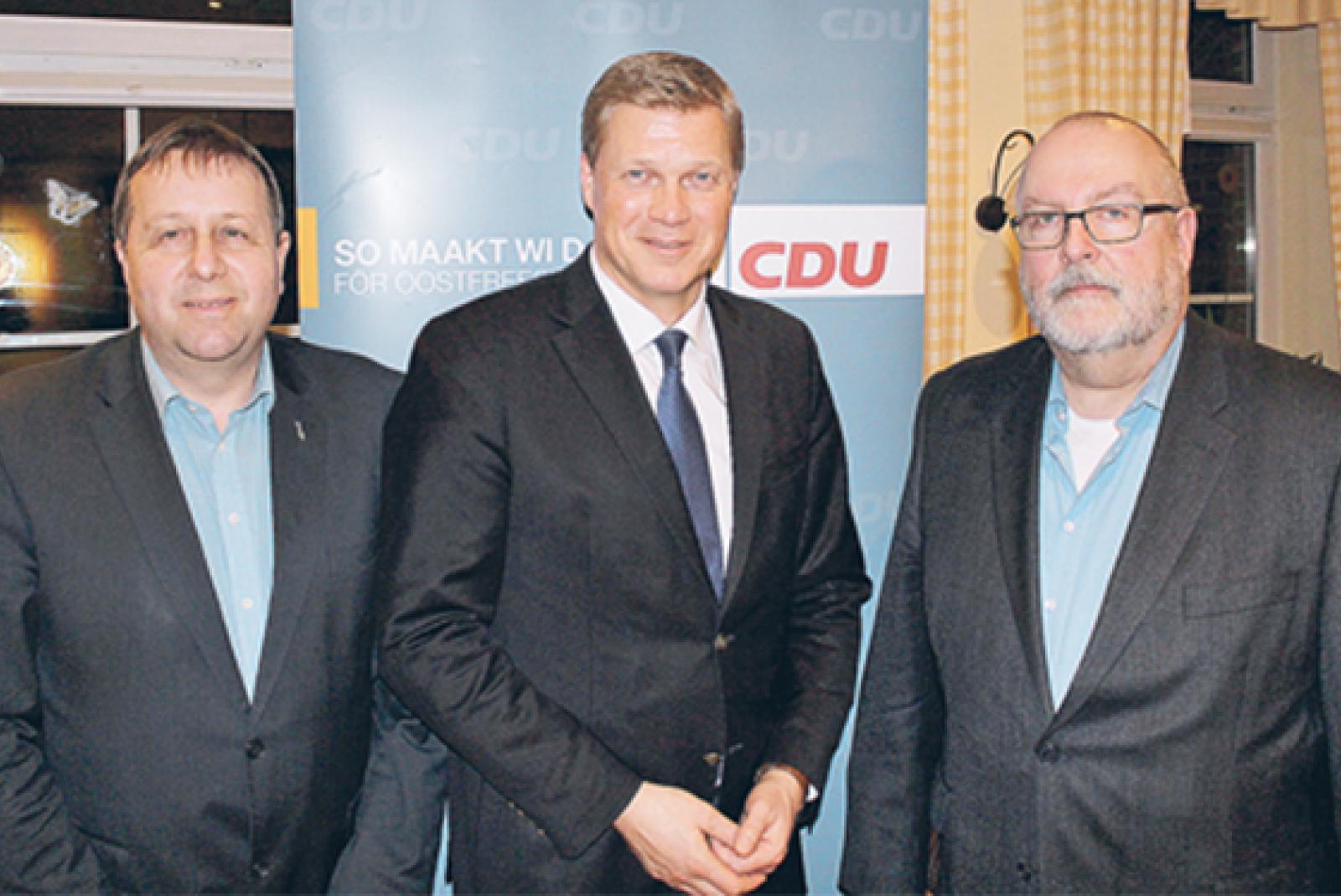Ulf Thiele (Mitte) soll wieder für den Landtag kandidieren. Das Bild zeigt ihn mit (links) Heinz Brunken (CDU Uplengen) und dem CDU-Kreisvorsitzenden Dr. Burkhard Wallesch. © Foto: CDU