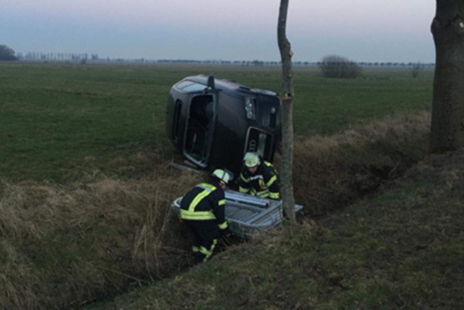 Der Fahrer war, in Fahrtrichtung Bundesstraße B70 fahrend, mit seinem Audi A3 nach rechts von der Straße abgekommen. Das Auto hatte sich dann nach einem Aufprall im Straßengraben überschlagen und war auf einem Feld zum Liegen gekommen. Dabei verfehlte der Wagen glücklicherweise knapp einen Straßenbaum. Der Fahrer konnte sich nicht selber befreien. Neben Rettungsdienst und Notarzt wurden deswegen auch die Feuerwehren aus Loga und Leer alarmiert. Wenige Minuten später waren die ersten Einsatzkräfte vor Ort. Nach einer Erstversorgung des 33-jährigen im PKW, schnitt die Feuerwehr die Frontscheibe des Audis heraus. Der Fahrer konnte so gerettet und an den Rettungsdienst übergeben werden. Parallel zur Rettung installierten die Einsatzkräfte eine Behelfsbrücke über den Straßengraben.
