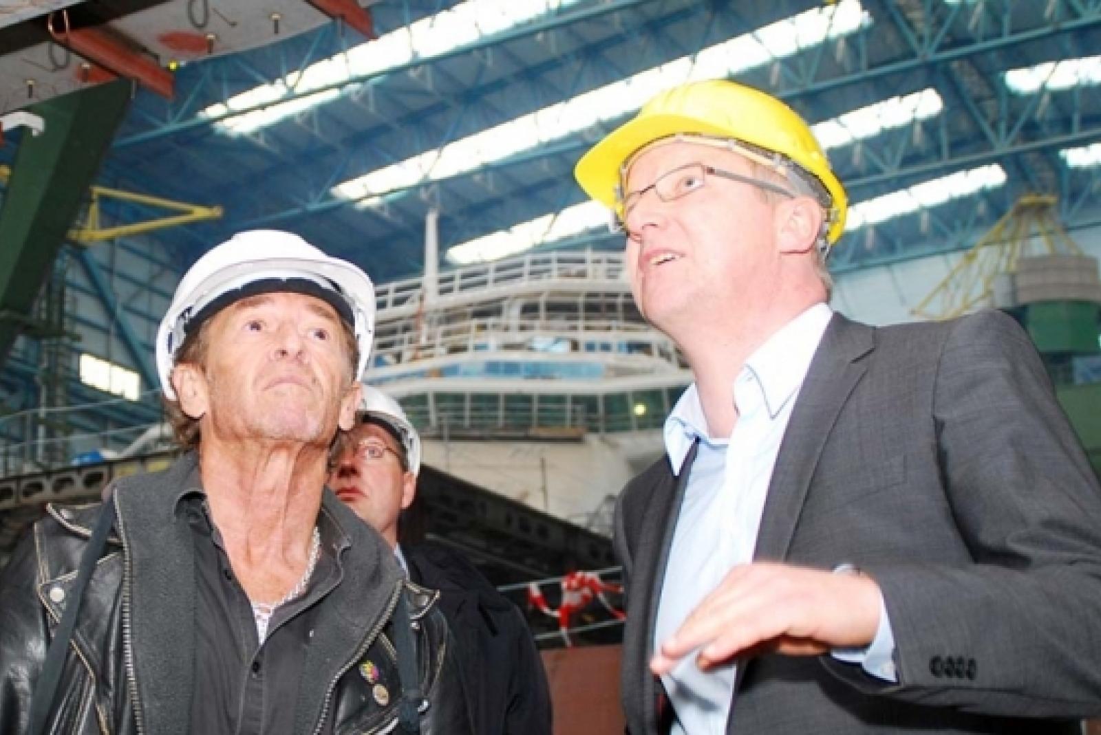 Große Augen machte Deutschrocker Peter Maffay beim Anblick der Ozeanriesen in Papenburg. Meyer-Pressesprecher Peter Hackmann (rechts) gab dem Star Einblicke in die Schiffbauwelt. © Fotos: Hanken