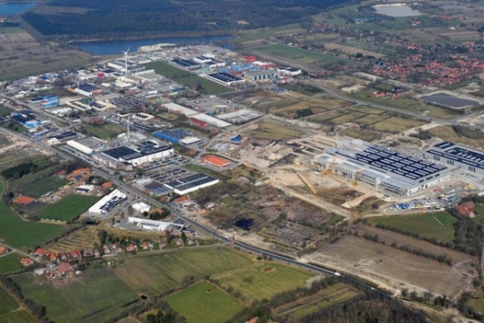 Besonders das Bauhauptgewerbe in Ostfriesland musste seine Kapazitäten aufgrund der hohen Auftragslage ausbauen. Die Luftaufnahme vom Frühjahr zeigt die Erweiterung des Gewerbegebietes in Tannenhausen/Sandhorst. Im Vordergrund sind das im Bau befindliche Rotorblattwerk vom Windenergieanlagenhersteller Enercon (rechts vorne) und das neue Tochterunternehmen »STA Stanztechnologie Aurich« (dahinter) zu sehen. © Foto: HWK