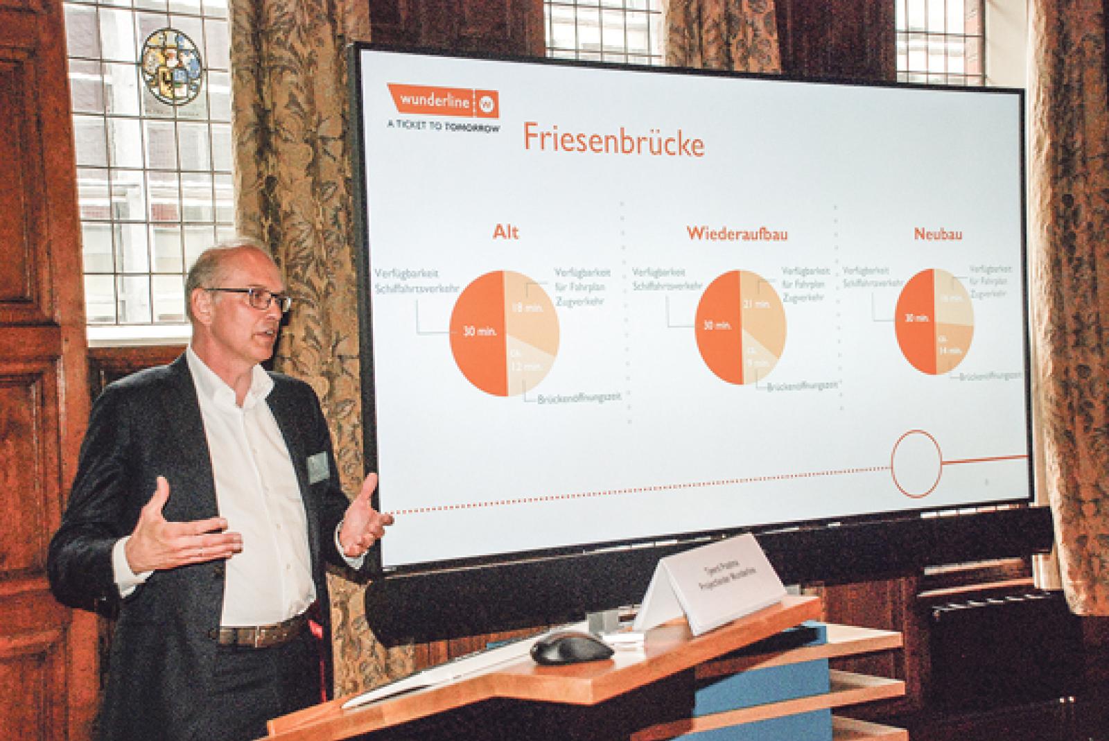 »Wir wollten eigentlich in 2025 mit der Wunderline in etwas mehr als zwei statt über drei Stunden mit einem emissionsfreien und innovativen Zug zwischen Groningen und Bremen verkehren, doch die kaputte Friesenbrücke hat uns einen Strich durch die Rechnung gemacht«, ...