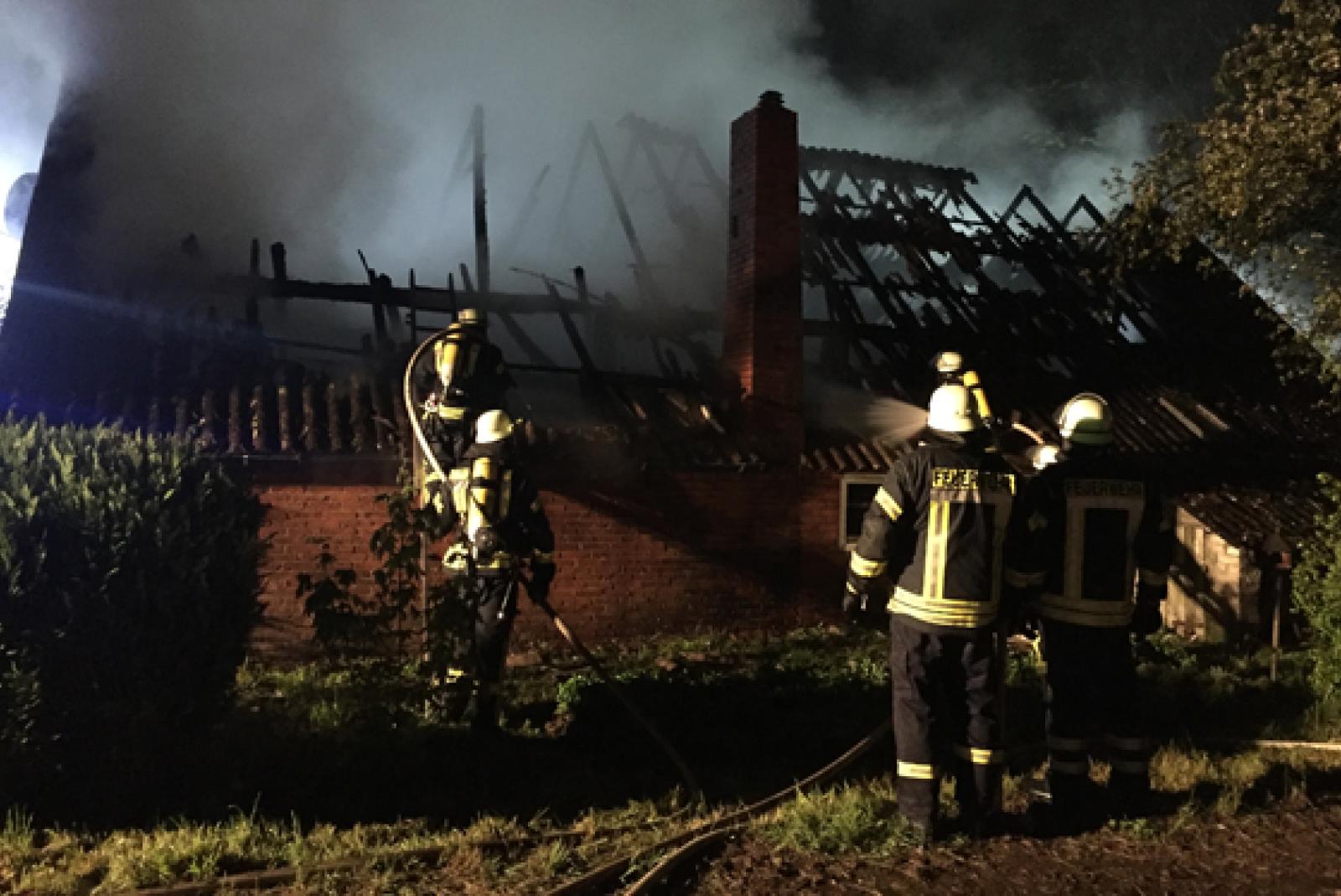 In Detern-Velde (Samtgemeinde Jümme) ist in der Nacht zu heute ein Wohngebäude komplett ausgebrannt. Eine ältere Dame, die Bewohnerin des Hauses, wurde leicht verletzt. Nachbarn hatten das Feuer um 23.55 Uhr bemerkt, nachdem sie von mehreren lauten Knallen aufgeschreckt waren. Das Feuer hatte sich zu diesem Zeitpunkt schon durch das mit Eternit-Platten belegte Dach gefressen, wie die Kreisfeuerwehr mitteilte.