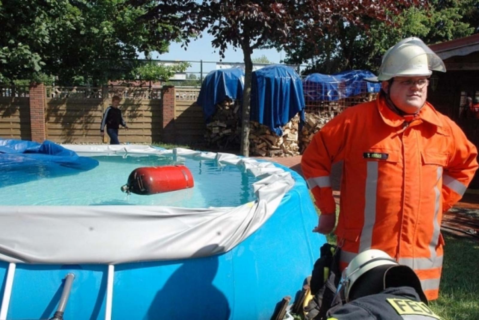 Dreimal Gefahr gebannt: Die Propangasflasche wird nach dem Löschen im Pool abgekühlt. © Fotos: de Winter/Loger/J. Rand