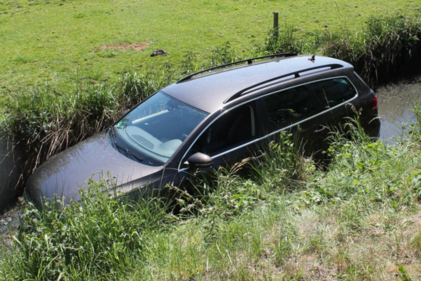 Ein Auto ist Samstagmittag in Stapelmoor in einer langgezogenen Kurve von der Hauptstraße abgekommen und in einem Graben gelandet. Der Fahrer und die Beifahrerin konnten sich aus eigener Kraft aus dem Fahrzeug befreien. Sie blieben bei dem Unfall unverletzt.