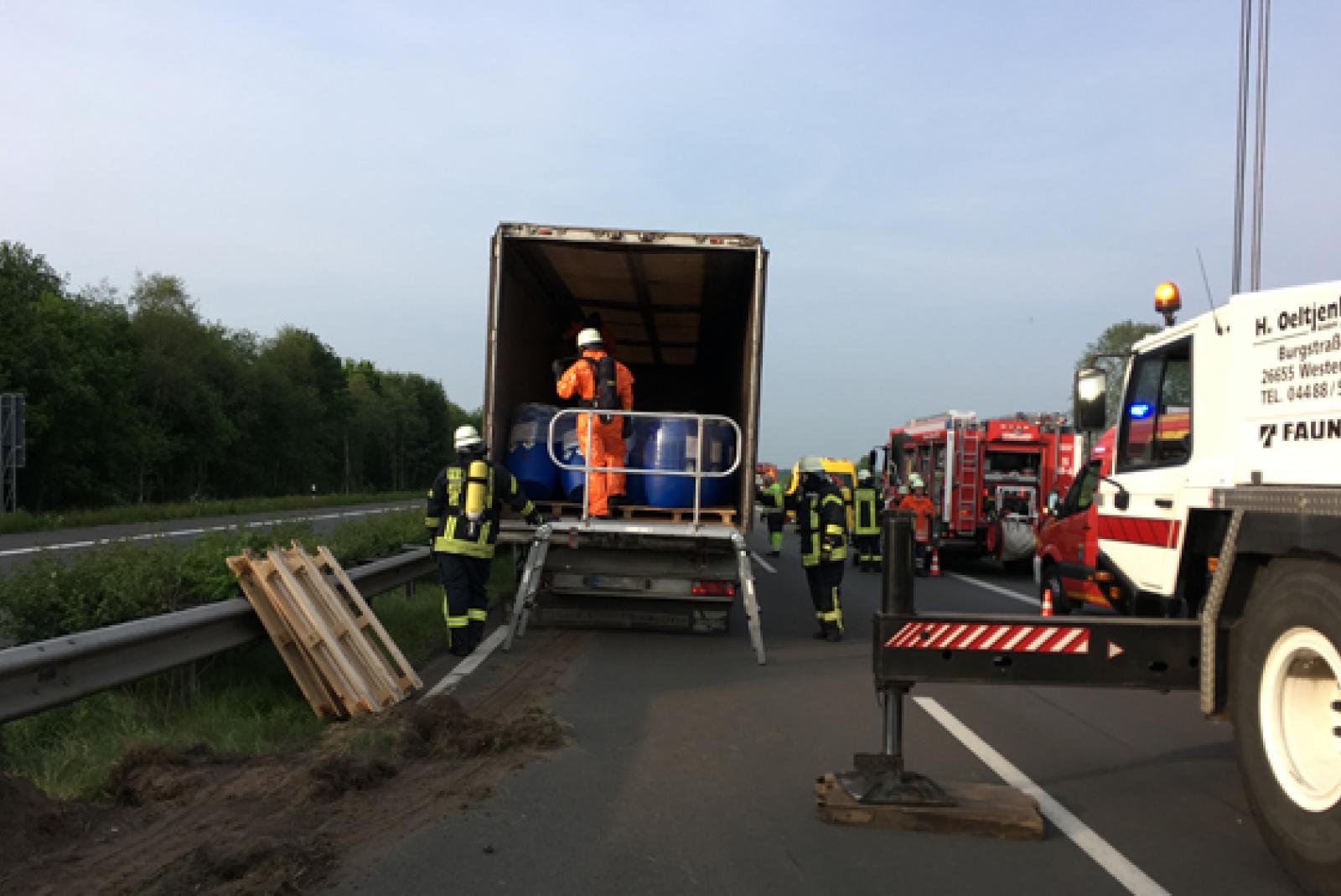 Zunächst rückten Polizei und Rettungsdienst zur Unfallstelle aus. Erst vor Ort bemerkten die Einsatzkräfte dann, dass es sich bei dem Sattelzug um einen Gefahrguttransporter handelte. Auf der Ladefläche waren große Mengen eines umweltgefährdenden und brennbaren Bodenschlamms aus Tanks in Kunststofffässern geladen. Eine Beschädigung der Ladung konnte nicht ausgeschlossen werden, weswegen um 16.41 Uhr dann die Feuerwehren aus Jübberde, Hollen und Remels sowie der Gefahrgutzug der Kreisfeuerwehr Leer alarmiert wurden.