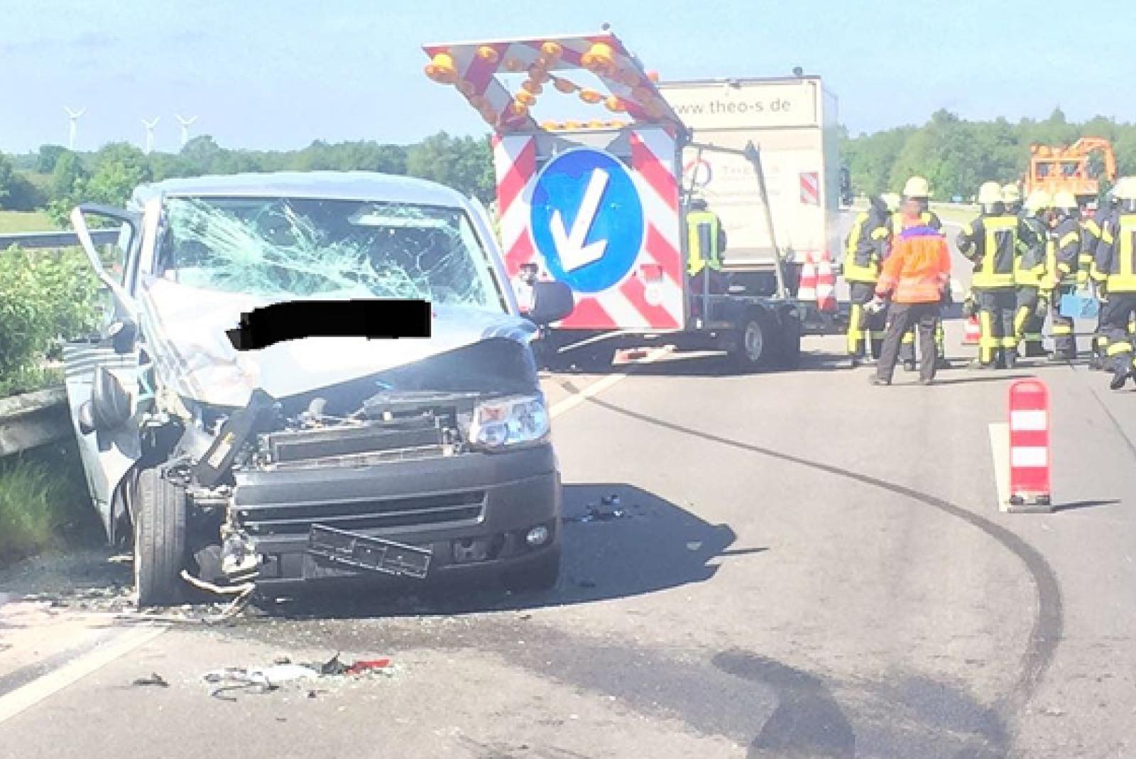 Den Angaben der Polizei zufolge ereignete sich der Unfall um 9.35 Uhr auf der Richtungsfahrbahn Leer zwischen den Anschlussstellen Westerstede-West und Apen/Remels. Zu diesem Zeitpunkt wurden Markierungsarbeiten auf der Autobahn durchgeführt. Die Wanderbaustelle wurde durch einen Lkw mit Sicherungsanhänger abgesichert, der sich auf dem rechten Fahrstreifen langsam fortbewegte. Die Wanderbaustelle war durch zwei sogenannte Vorwarner bereits im Vorfeld auf einer Entfernung von 500 Metern sowie auch auf 1000 Metern vorschriftsmäßig abgesichert, so die Polizei. Ein 37-jähriger Fahrer eines Transporters aus Rastede erkannte die Situation dennoch zu spät und prallte mit seinem Fahrzeug auf den Sicherungsanhänger. Hierdurch wurden sowohl der Unfallverursacher als auch der 49-jährige Fahrer des Sicherungsfahrzeugs aus dem Raum Osnabrück leicht verletzt. Beide Fahrzeuge und die Autobahnleitplanke wurden stark beschädigt.
