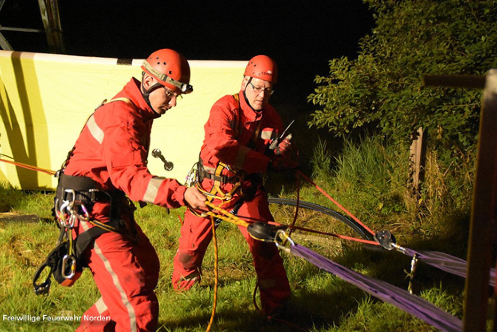 Um die Männer zu retten, rückte die Fachgruppe »Spezielle Rettung aus Höhen und Tiefen« der Feuerwehr Emden an. Erstmalig kam die Spezialeinheit in Norden zum Einsatz, dazu auch noch bei Nacht. Zwei Höhenretter der siebenköpfigen Gruppe kletterten zu dem Duo hoch und sicherte es zunächst. Anschließend wurden beide Männer nacheinander in Begleitung eines Höhenretters abgeseilt und dem Rettungsdienst übergeben. Gegen 1 Uhr waren alle Personen wieder sicher am Boden.