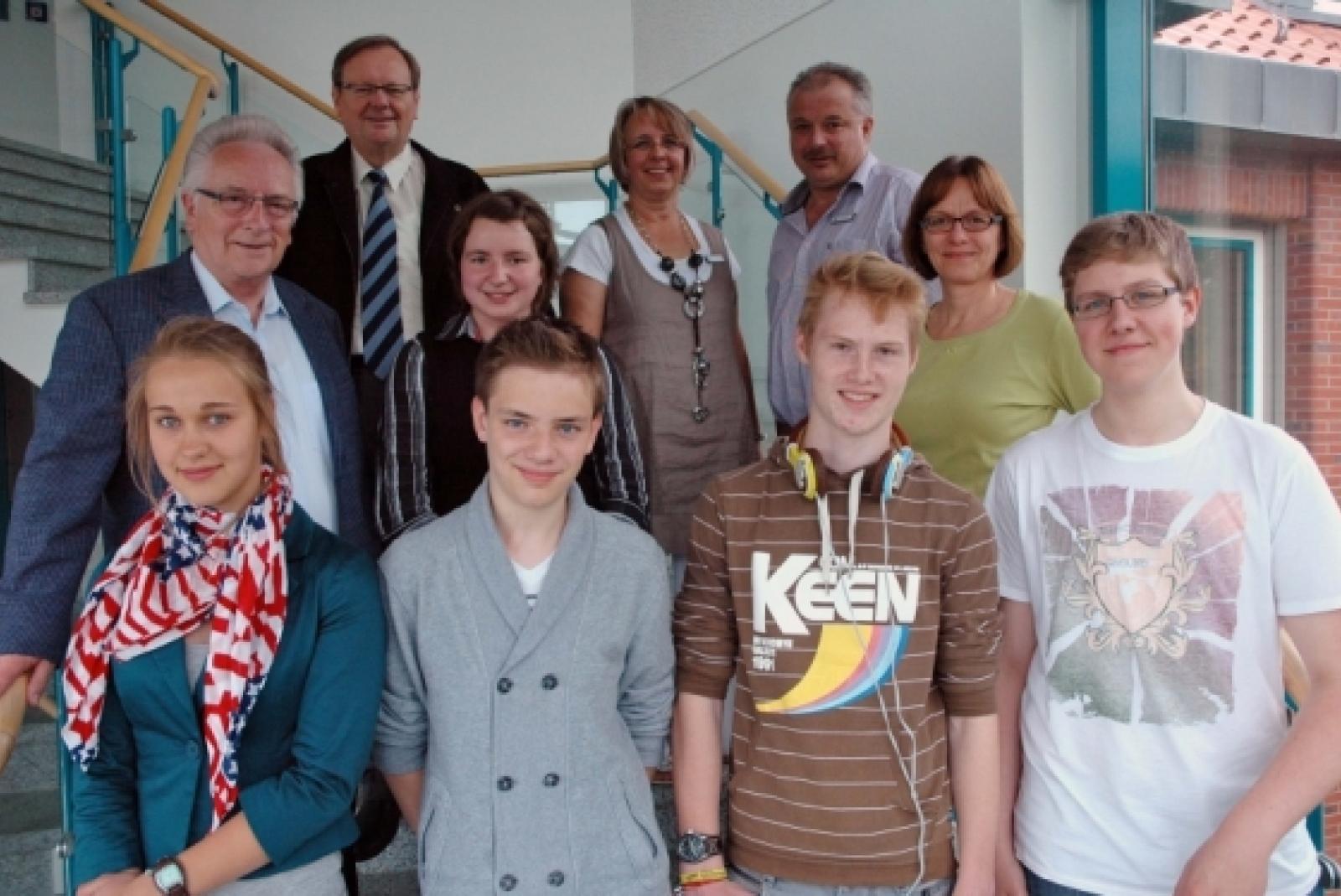 Vier Rheiderländer sind Plattdeutsch-Beauftragte an ihren Schulen: Gertje Bruhns aus Ditzum (Teletta-Groß-Gymnasium), Jonas Hilbrands aus Weener (Freie Christliche Schule), Willm Wilkens aus Weener und Heyo Memenga aus Bunde (beide Ubbo-Emmius-Gymnasium, vorne von links). Darüber freuen sich Landschaftspräsident Helmut Collmann, Landschaftsrat Dieter Baumann, Referentin Imke Schulte, die Plattdeutsch-Beauftragten des Landkreises Leer, Gertrud Reitmeyer und Artur Reents, sowie Cornelia Nath vom Plattdeutschbüro der Ostfriesischen Landschaft (oben von links). © Foto: Szyska