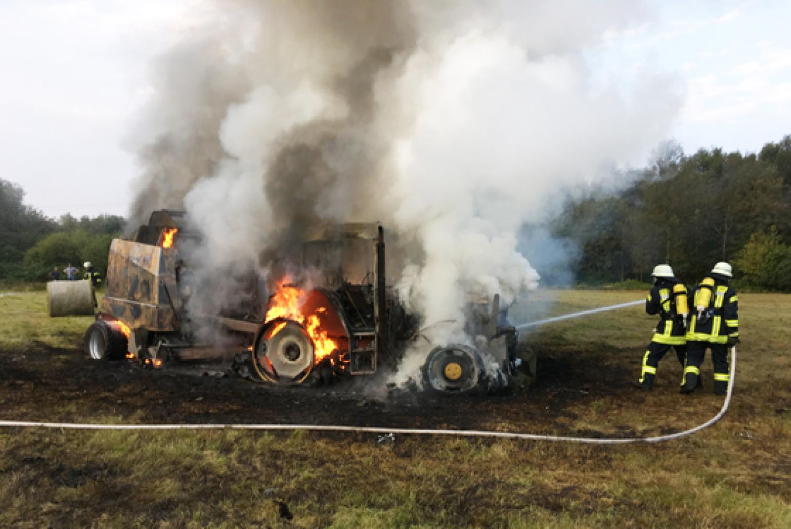 Am Dienstagabend sind auf einem Feld am Schäferweg in Großsander (Uplengen) ein Traktor und eine Rundballenpresse komplett ausgebrannt. Der Fahrer, ein Lohnunternehmer, bemerkte das Feuer an seinem Fahrzeug gerade noch rechtzeitig, um sich in Sicherheit bringen zu können.