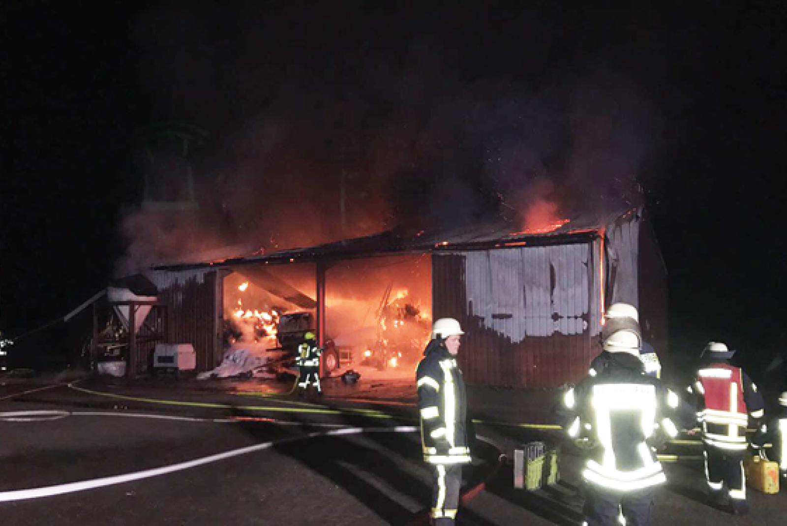 Gegen 3 Uhr wurde deswegen der Fachzug Logistik der Kreisfeuerwehr zur Verpflegung der Einsatzkräfte alarmiert. Etwa 100 Feuerwehrleute waren vor Ort. Die Löscharbeiten zogen sich bis in den Vormittag hin. Die Halle und auch die landwirtschaftlichen Geräte und Maschinen darin wurden nahezu vollständig zerstört. Wie es zu dem Feuer gekommen ist, ermittelt jetzt die Polizei.