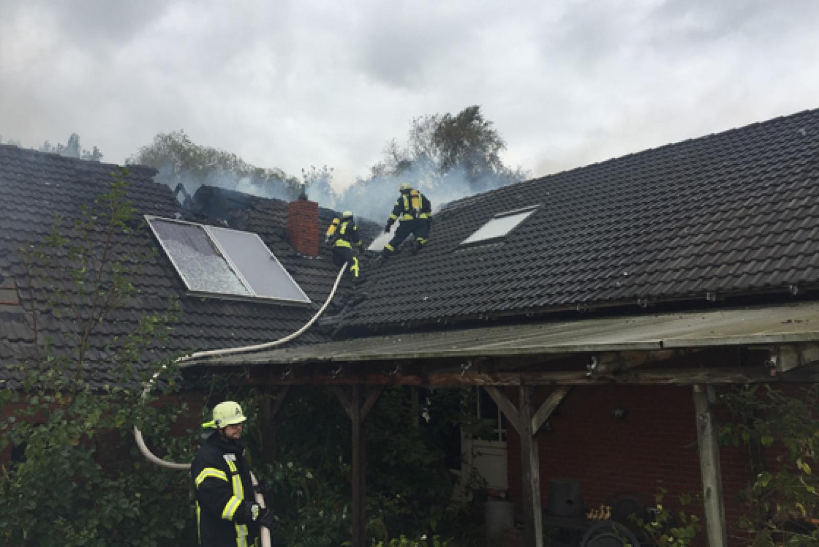 Wenige Minuten später waren erste Einsatzkräfte vor Ort. Zu diesem Zeitpunkt schlugen aus dem hinteren Gebäudeteil bereits die Flammen durchs Dach. Umgehend wurde ein massiver Löschangriff über mehrere Rohre eingeleitet. Die Alarmstufe wurde erhöht und weitere Kräfte aus Veenhusen und Hatshausen nachalarmiert. Zudem rückte die SEG Florian des Deutschen Roten Kreuzes mit aus.