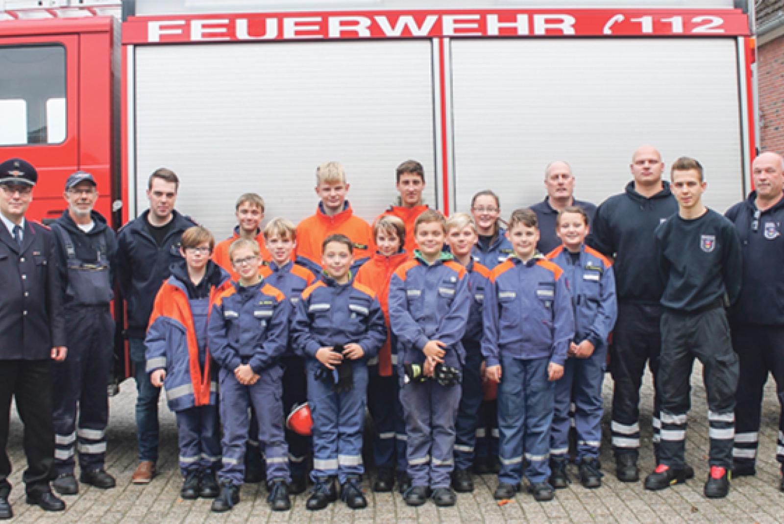 Die Jugendflamme der Stufe 1 ist jüngst 13 Jugendlichen durch Stadtjugendfeuerwehrwart Ewald Freese im Beisein von Stadtbrandmeister Jörg Fisser beim Feuerwehrhaus in Weener abgenommen.
