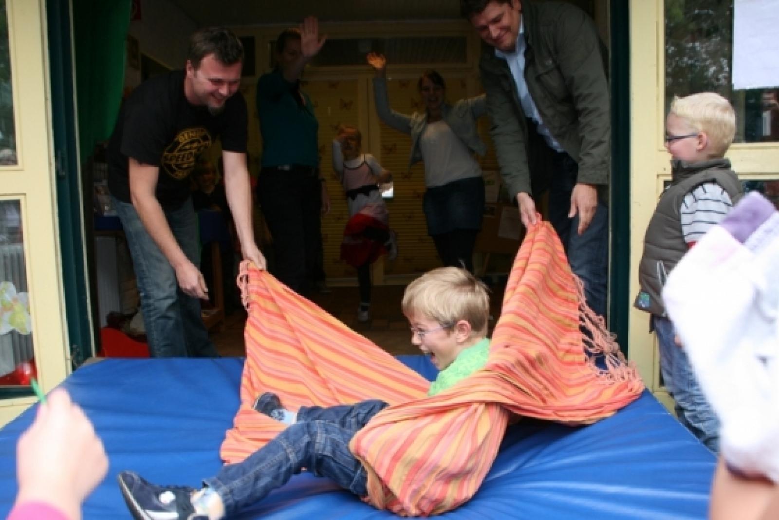 Spaßiger Brauch: Buchstäblich rausgeworfen wurden die Vorschulkinder aus dem Kindergarten in Bingum. © Goeman