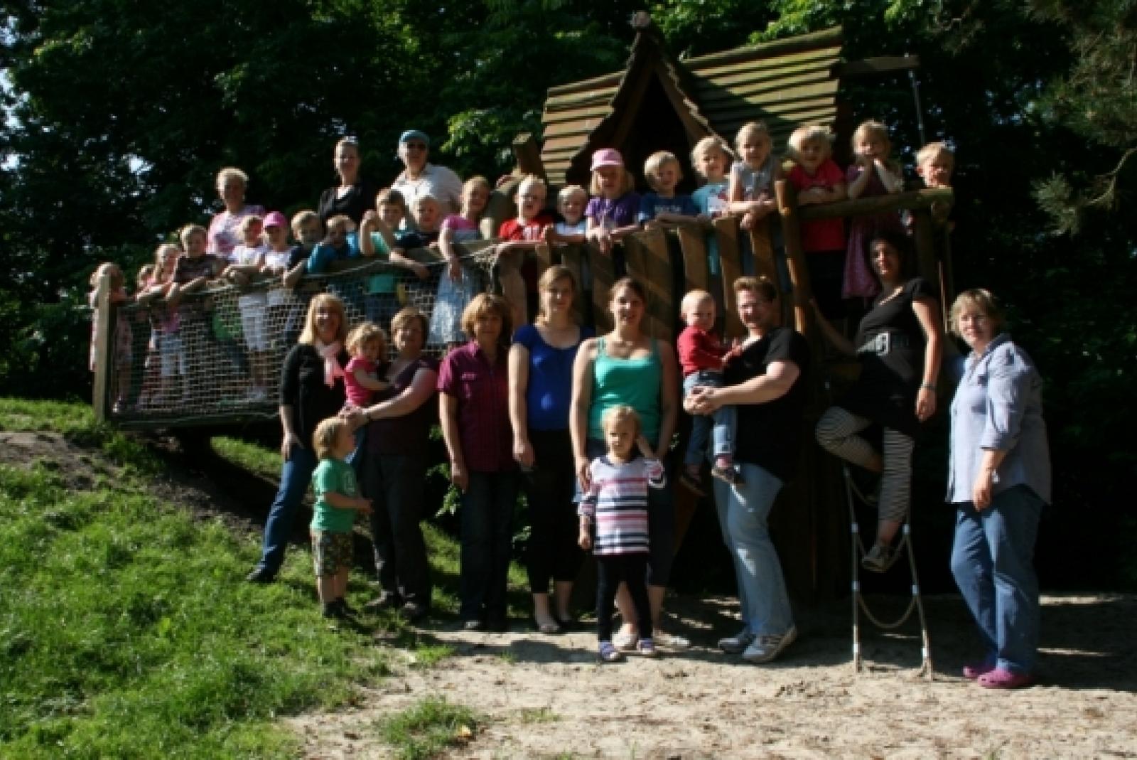 Vor dem »Hexenhaus« hat sich die Rasselbande des Bingumer Kindergartens »Sünntuitjes« mit der neuen Leiterin Christiane Bauer (unten links) und den anderen Erzieherinnen für den Fotografen postiert. © Goeman