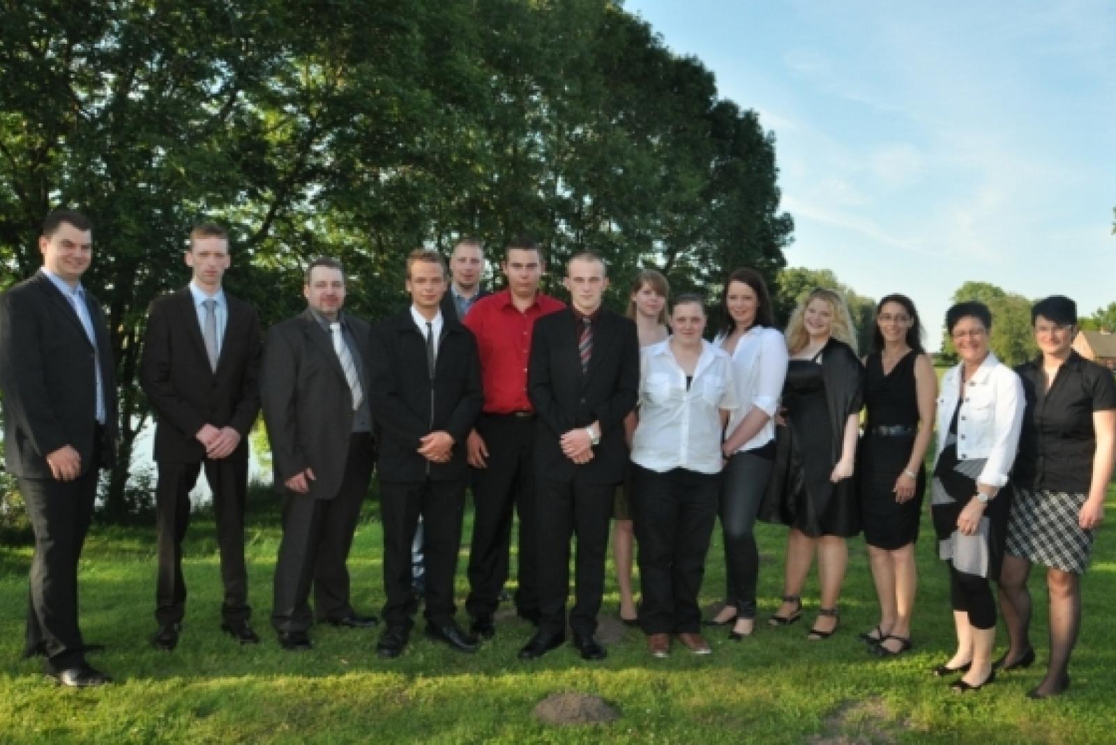 Obermeister Markus Leggedör (links) ist stolz auf die Leistungen der Absolventen, neben ihm (von links) Christian Tütjer und Michael Stumpf (beide Prüfungsausschuss); Markus Winterboer (Weener), Gunnar Dieke, Andre Schütte, Mirko ter Haseborg, Katrin Gers, Tina Menke, Hanna Harms, Carina Albers und Hedwig Wegner (Absolventin Denise Gentz aus Bunde fehlt); Elisabeth Hüser und Ulrike Poll (beide von der Berufsschule).  © Wolters