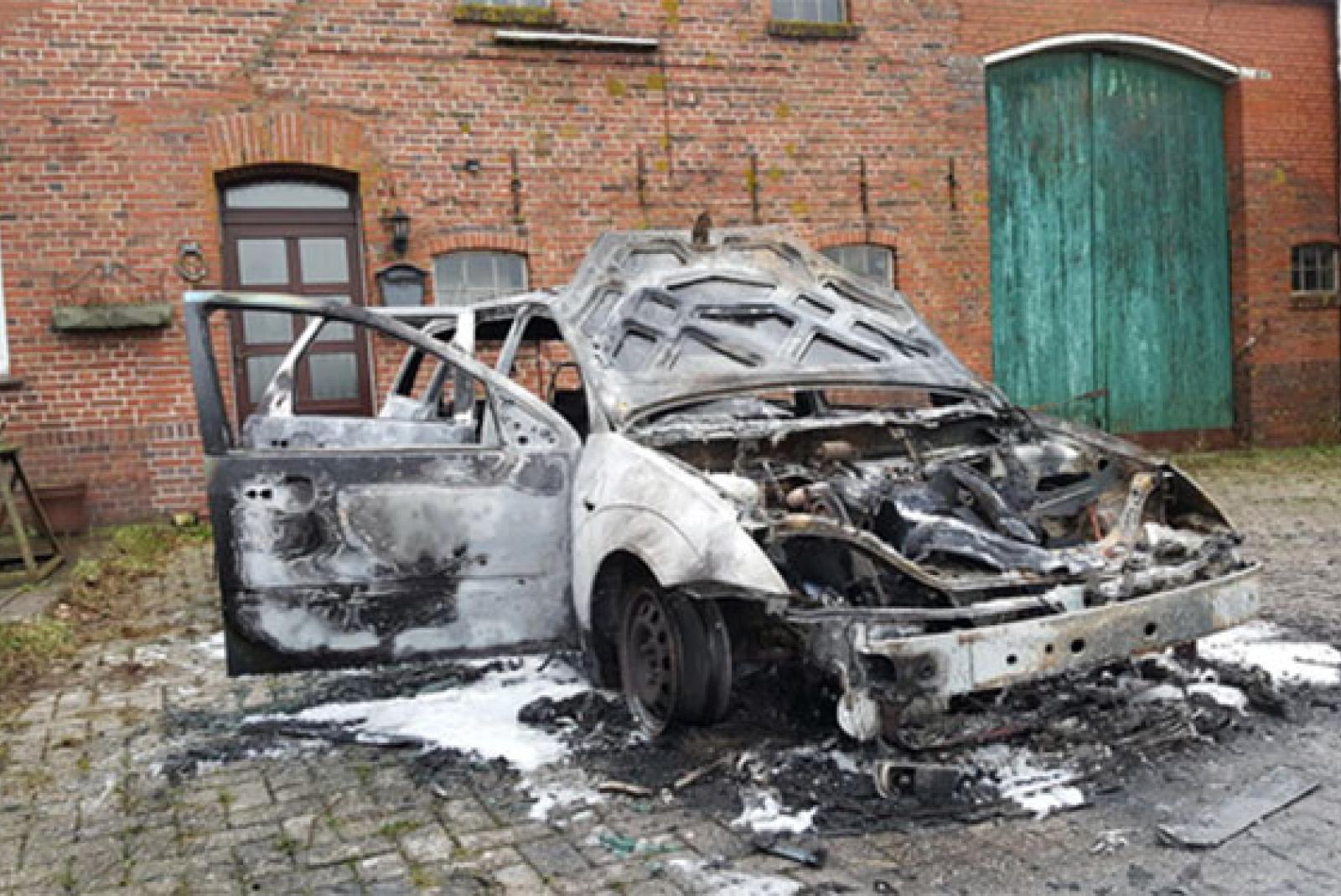 Heute Morgen ist auf einem Hof am Leißeweg in Amdorf ein Auto in Brand geraten. Der Pkw wurde vollständig zerstört.