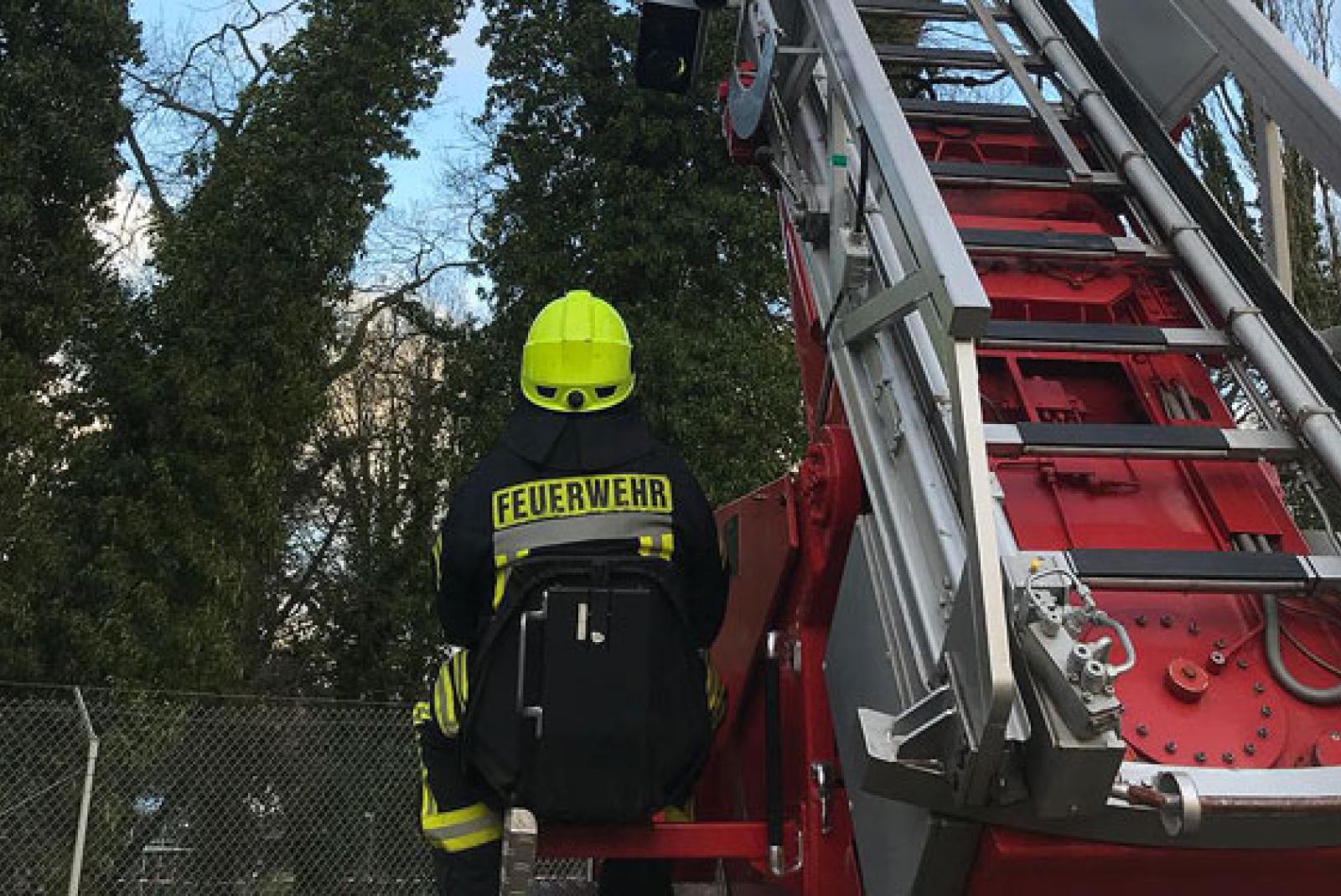 Diese rückte mit zwei Fahrzeugen an. Die Feuerwehren trugen mithilfe einer Drehleiter dann zunächst einen Teil der Krone ab und fällten den Baum dann ganz.