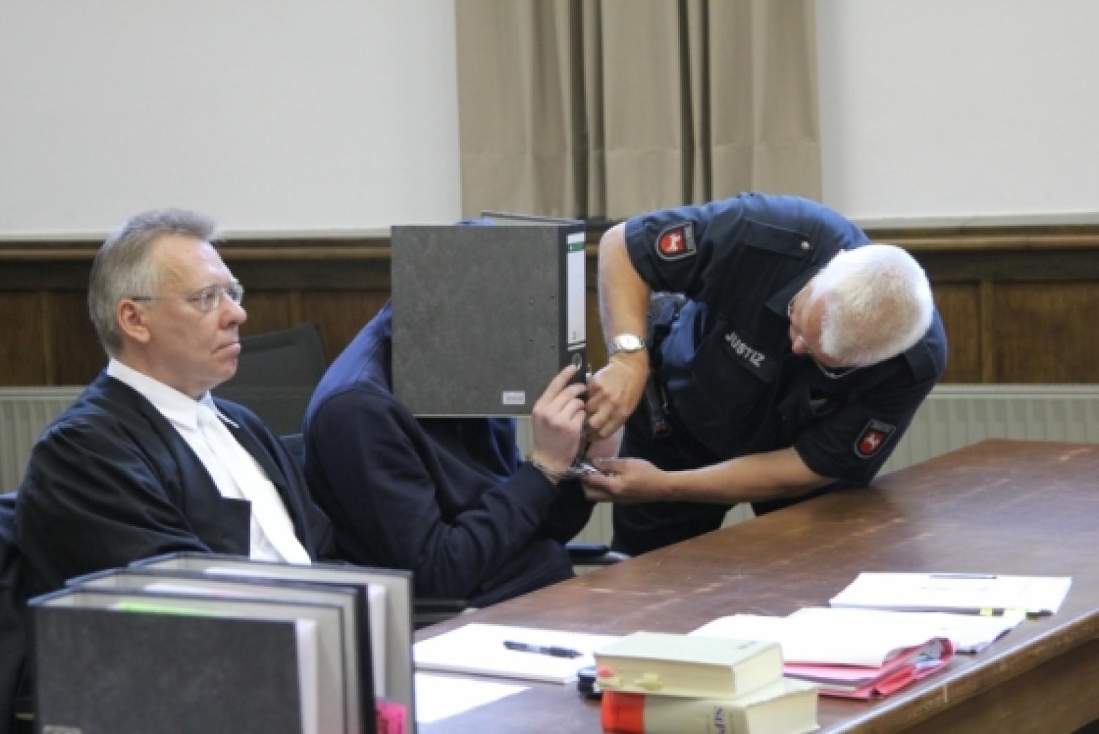 Ein Justizbeamter nimmt dem Angeklagten David H., der sein Gesicht hinter einem Aktenordner verbirgt, im Saal des Auricher Landgerichts die Handschellen ab. © Banik