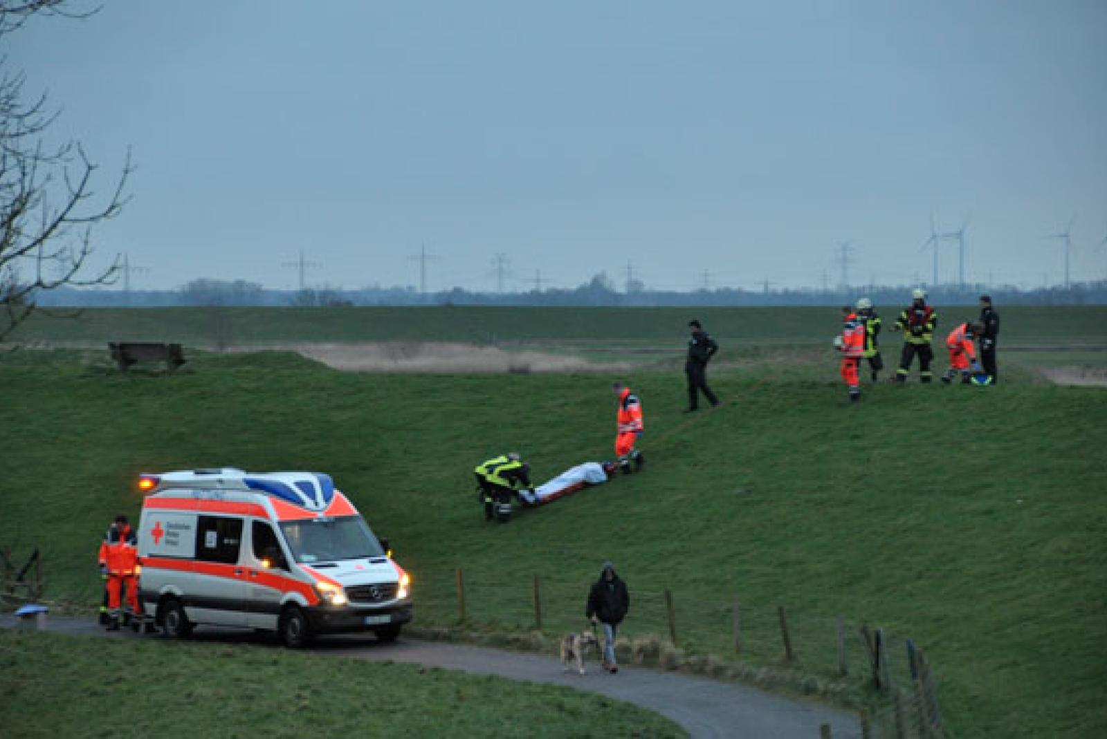 Ein Sparziergänger entdeckte den hilflosen Mann. Um 16.44 Uhr wurde ein Notruf abgesetzt. Erste Einsatzkräfte waren schnell vor Ort und kümmerten sich um den hilflosen Mann. Die Feuerwehr musste zunächst ein Tor zum Deichverteidigungsweg mit einem Bolzenschneider öffnen, damit die Einsatzfahrzeuge zur Unglücksstelle fahren konnten.
