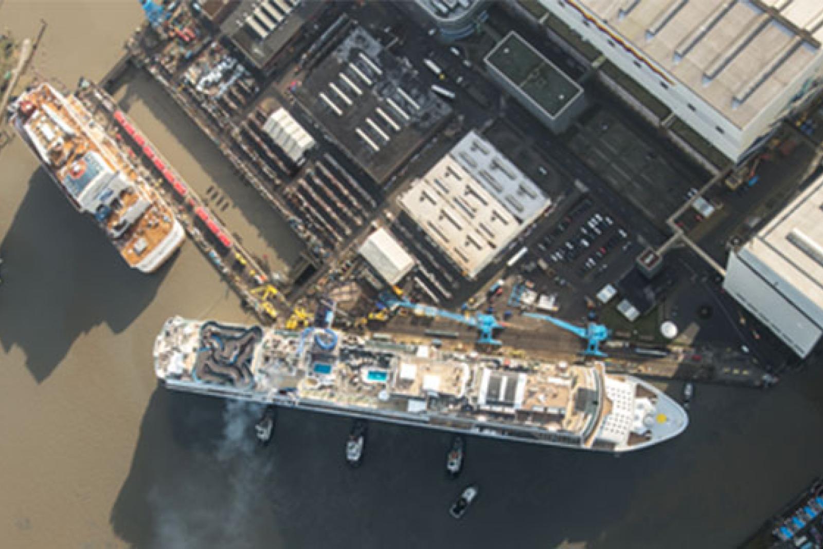Bei strahlendem Sonnenschein ist die »Norwegian Bliss« aus dem Baudock der Meyer Werft geschlüpft. Da zwei weitere Schiffs-Elemente im Hafenbecken lagen, wurde es zeitweise eng. Der Werfthafen in Papenburg wurde am Samstag zum Verschiebe-Bahnhof. Das Ausdocken des neuen Luxusliners »...