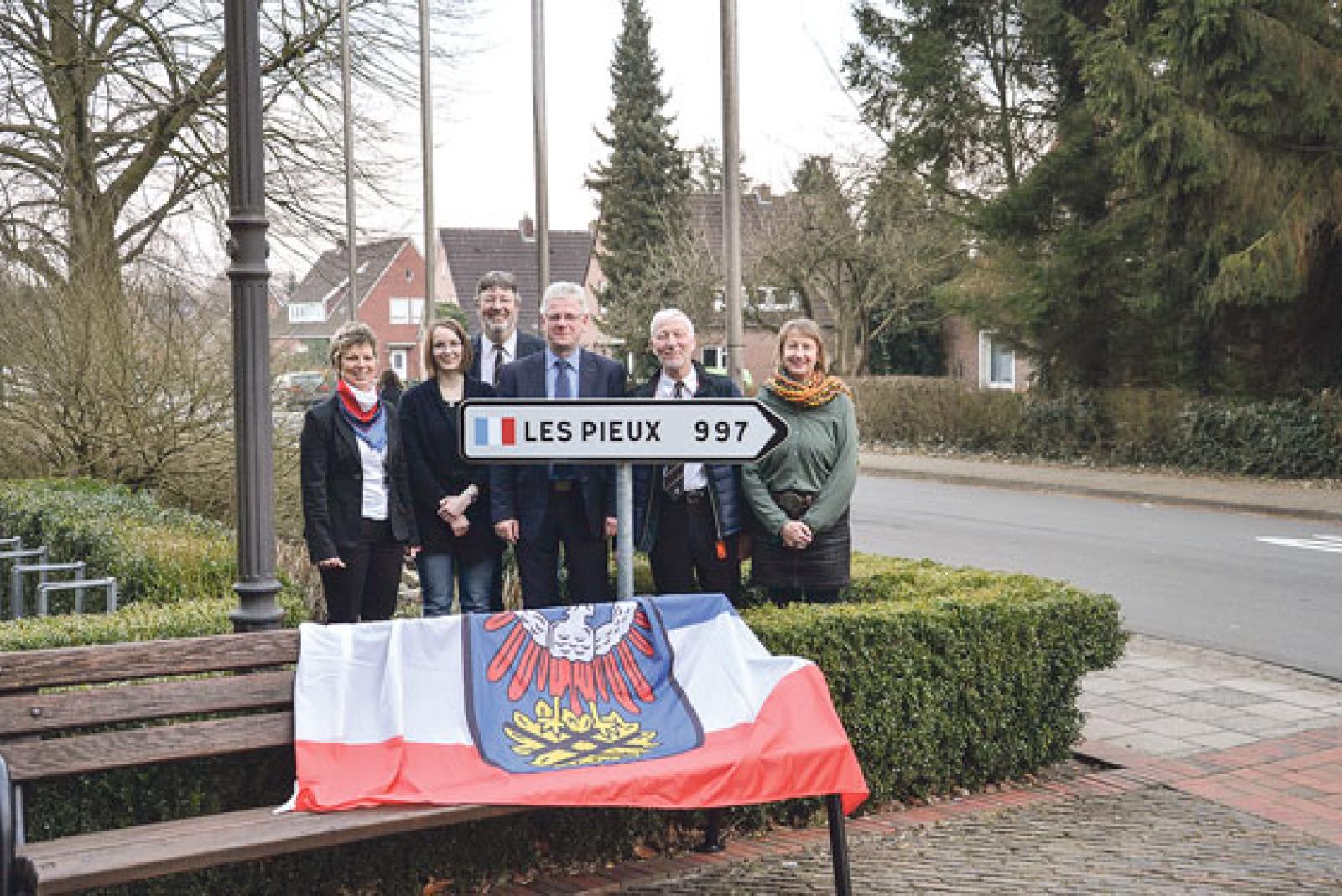 Ein der Stadt Weener von ihrer französischen Partnerstadt Les Pieux geschenktes Verkehrsschild hat nun im Vorgarten des Eingangsbereiches zum Rathaus an der Osterstraße einen festen Platz gefunden. Hier zeigt das Schild in Richtung der 997 Kilometer entfernten Partnerstadt. Nach ...