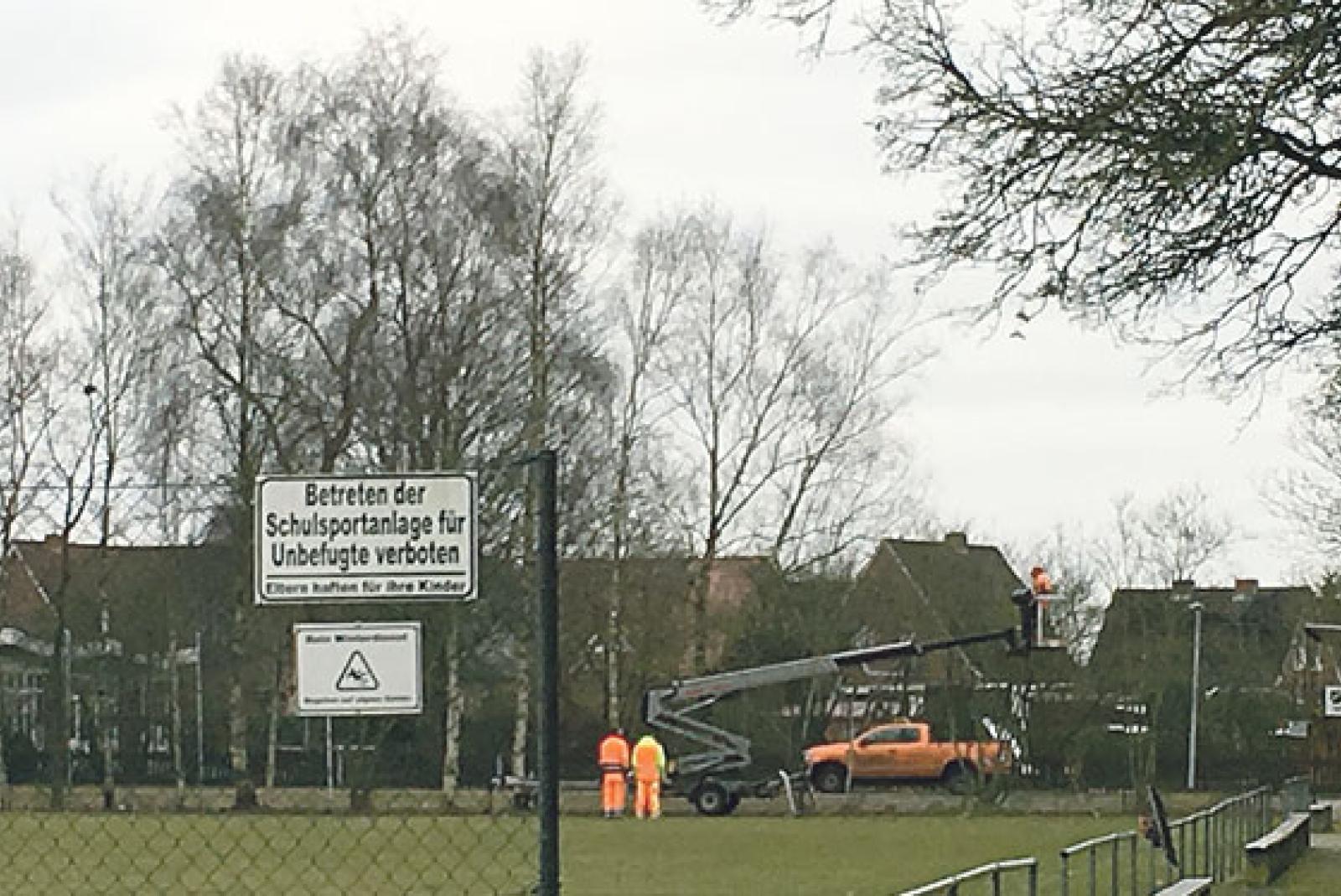 Bei der »Lichtmast-Affäre« in Holthusen deutet sich eine einvernehmliche Lösung an: Mitarbeiter des städtischen Bauhofes sind derzeit dabei, den von Bäumen umgebenen Flutlichtmast auf dem Sportplatz des TuS Holthusen freizuschneiden.