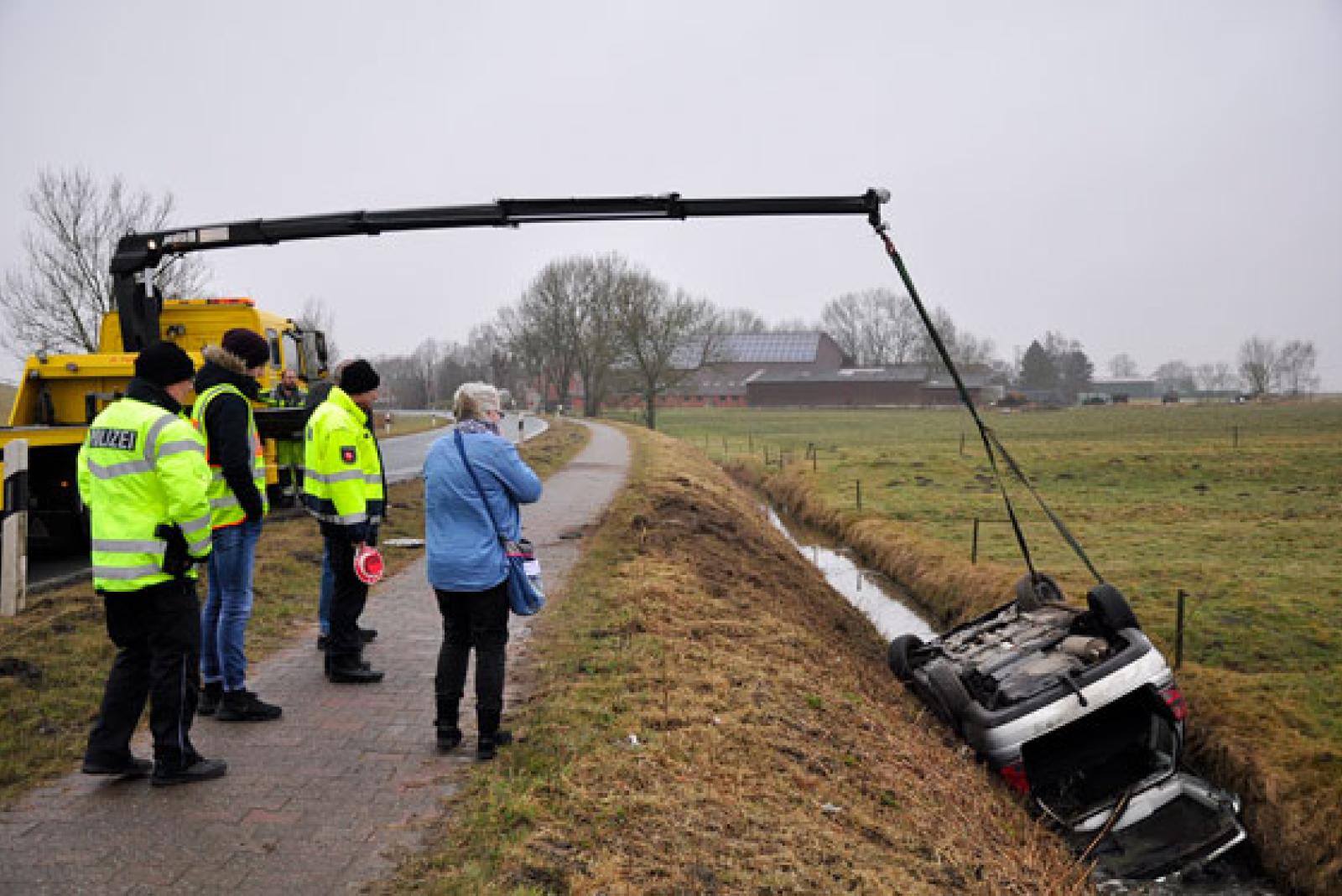 Die 23-jährige Frau war mit ihrem VW Bora auf der Rorichumer Straße in Richtung Leer unterwegs, als sie »aus ungeklärter Ursache«, so die Polizei, mit ihrem Fahrzeug zunächst kurz nach rechts und anschließend nach links von der Fahrbahn abkam. Der VW Bora der jungen Frau überschlug sich hierbei und blieb auf dem Dach in einem wasserführenden Graben zum Stillstand. Vorbildlich handelte nach Angaben der Polizei ein Lastwagenfahrer, der als Ersthelfer an der Unfallstelle anhielt. Mit seiner Hilfe gelang es der völlig durchnässten Frau, sich über den Kofferraum aus dem Fahrzeug zu befreien. Die 23-Jährige erlitt leichte Verletzungen. Ein Rettungswagen brachte sie schließlich in ein Krankenhaus. Das Unfallfahrzeug, an dem erheblicher Sachschaden entstand, wurde durch einen Abschleppdienst geborgen. Da Betriebsstoffe drohten, in den Graben zu laufen, informierten die Polizeibeamten vorsorglich die Untere Wasserbehörde des Landkreises. Letztlich kam es allerdings zu keiner Wasser- oder Bodenverunreinigung.