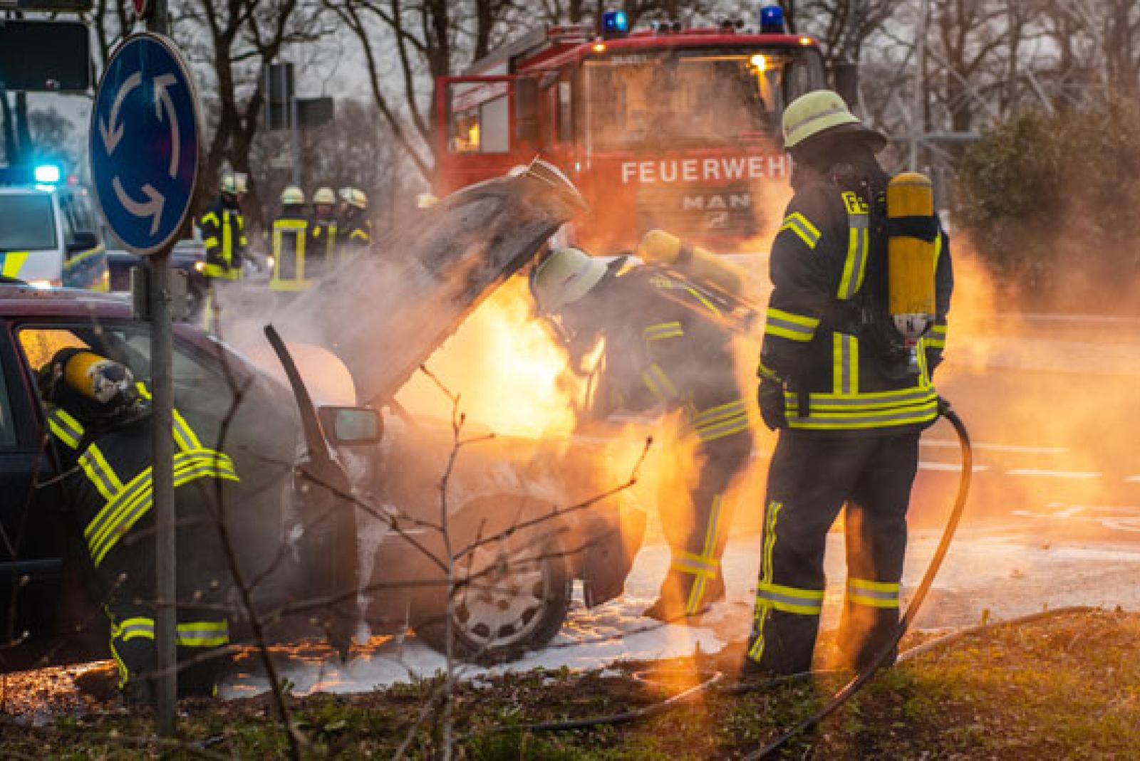 Feuerwehren löschen brennendes Auto am Kreis in Stapelmoorerheide