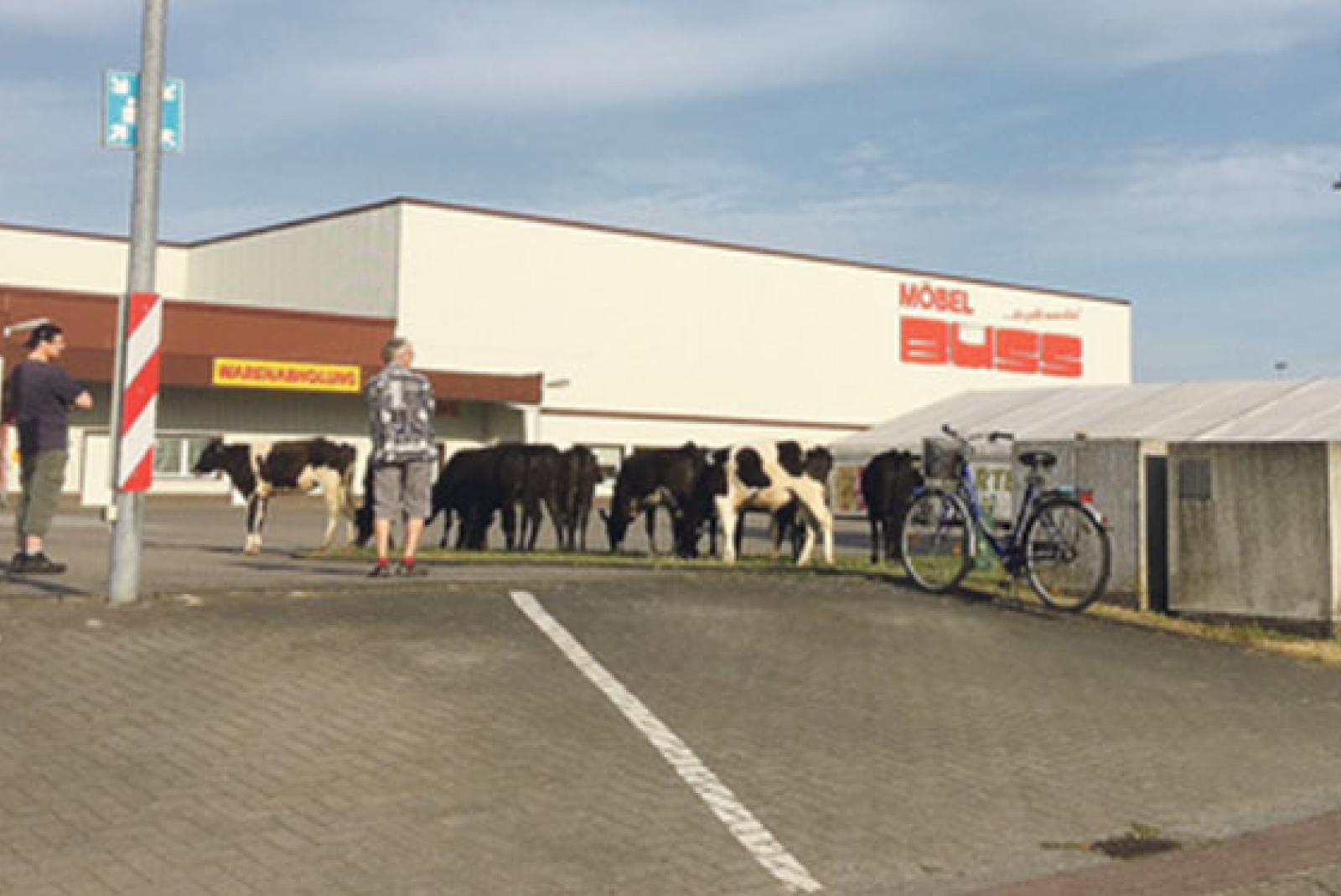 Mehrere ausgebrochene Kühe machten sich heute Morgen zum Möbelhaus »Buss« in Wiesmoor auf.