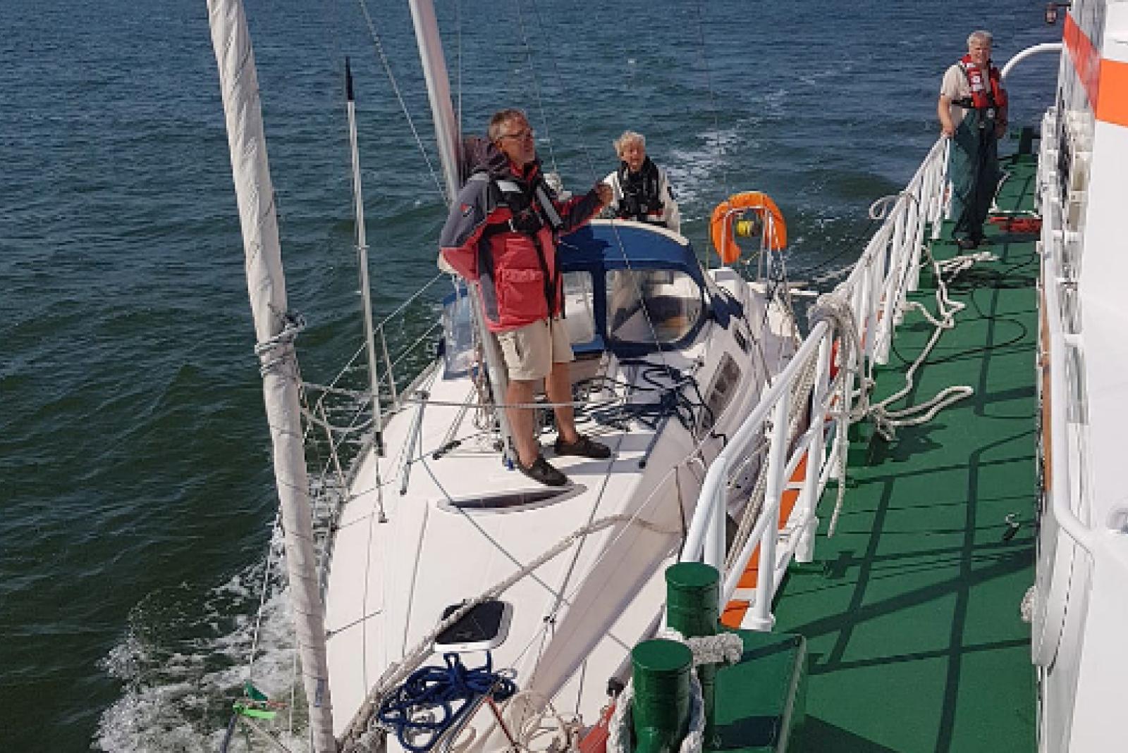Unterdessen war bereits ein Gaffelsegler beim Havaristen angekommen und schleppte ihn in Richtung der ostfriesischen Insel. Ebenso bot der Hochsee-Bergungsschlepper „Nordic“ seine Hilfe an, der sich unweit der Unglücksstelle befand. Seine Unterstützung war jedoch nicht mehr notwendig, da die Seenotretter bereits vor Ort eingetroffen waren: „Die Segler waren sehr erleichtert, als wir bei ihnen längsseits gingen und unsere leistungsstarke Lenzpumpe übergaben“, erzählt Vormann Gerd Schwips. Mit ihnen gelang es schließlich, den Wassereinbruch unter Kontrolle zu bekommen – langsam sank der Wasserstand im Inneren der Segelyacht.