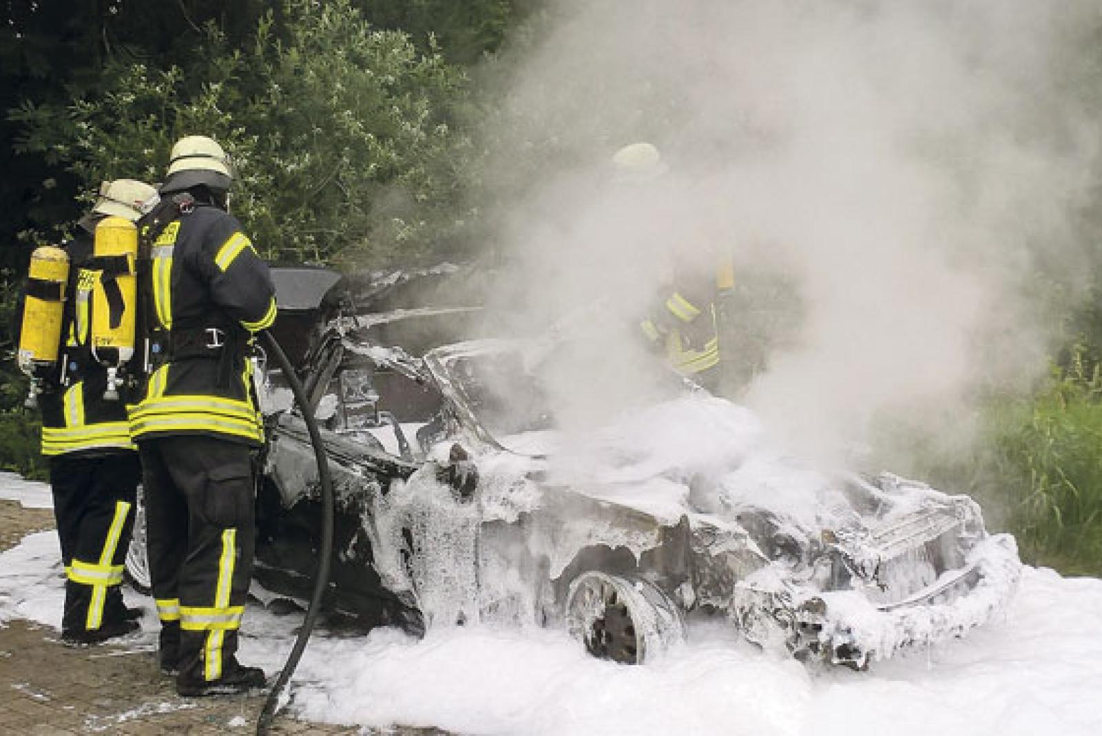 Feuerwehr löscht brennendes Fahrzeug an der Abfahrt in Möhlenwarf
