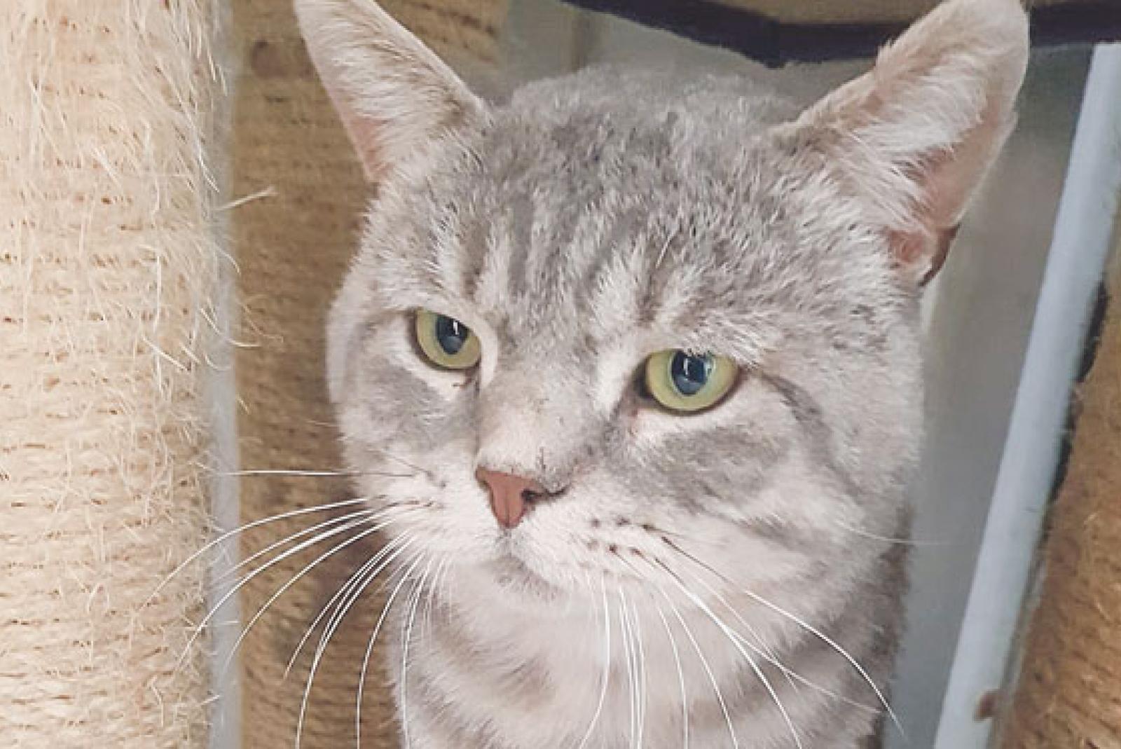 »Dusty« ist ein schön gezeichneter, hellgrauer Kater, der im Tierheim in Stapelmoor auf ein neues Zuhause wartet.