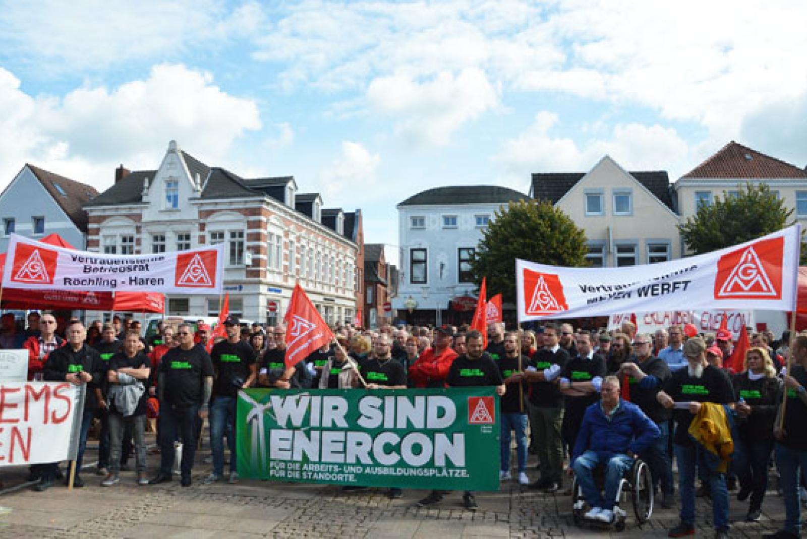 »Wir sind Enercon« – immer wieder hallte dieser Ruf am Sonnabend über den Auricher Marktplatz. Wie eine Sportmannschaft, die damit vor einem Wettbewerb ihren Teamgeist beschwört, betonten die Beschäftigten des Windenergieanlagenherstellers Enercon damit ihren Zusammenhalt. Auch sie stehen derzeit ...