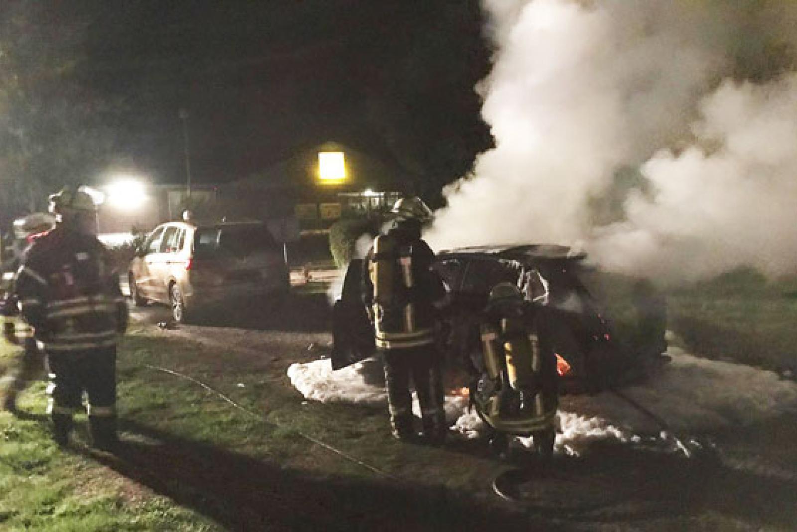 Passanten hatten den Brand bemerkt und die Feuerwehr gerufen. Als wenige Minuten nach dem Alarm die ersten Kräfte vor Ort waren, stand ein VW Polo in Vollbrand. Das Feuer drohte, auf ein weiteres ausgestellte Fahrzeug überzugreifen, so die Kreisfeuerwehr in einer Mitteilung.