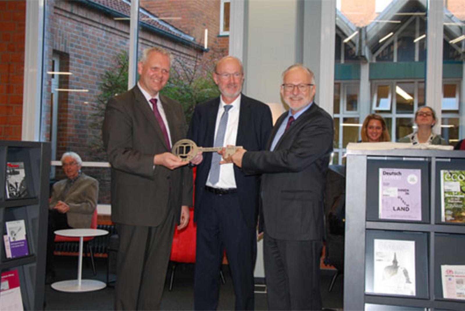 Im Beisein von rund 100 Gästen ist heute die grundsanierte Bibliothek der Hochschule Emden/Leer eröffnet worden. Klaus Wieting, Leiter des Staatlichen Baumanagements Ems-Weser, übergab den Schlüssel am Nachmittag bei einer Feierstunde an Wissenschaftsminister Björn Thümler ...