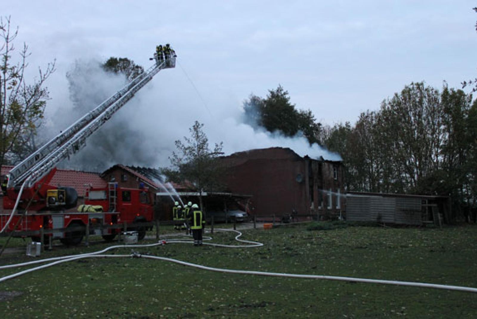 Wie die Feuerwehr mitteilte, wurden die Helfer heute gegen sechs Uhr zu einem Schornsteinbrand in die Ortschaft Blandorfer Wichte bei Hage alarmiert. Bereits beim Eintreffen der ersten Einsatzkräfte in der Lottjeshausener Straße wurde die Alarmstufe erhöht, weil es sich um einen Dachstuhlbrand eines ehemaligen landwirtschaftlichen Gebäudes mit Ferienwohnungen handelte.